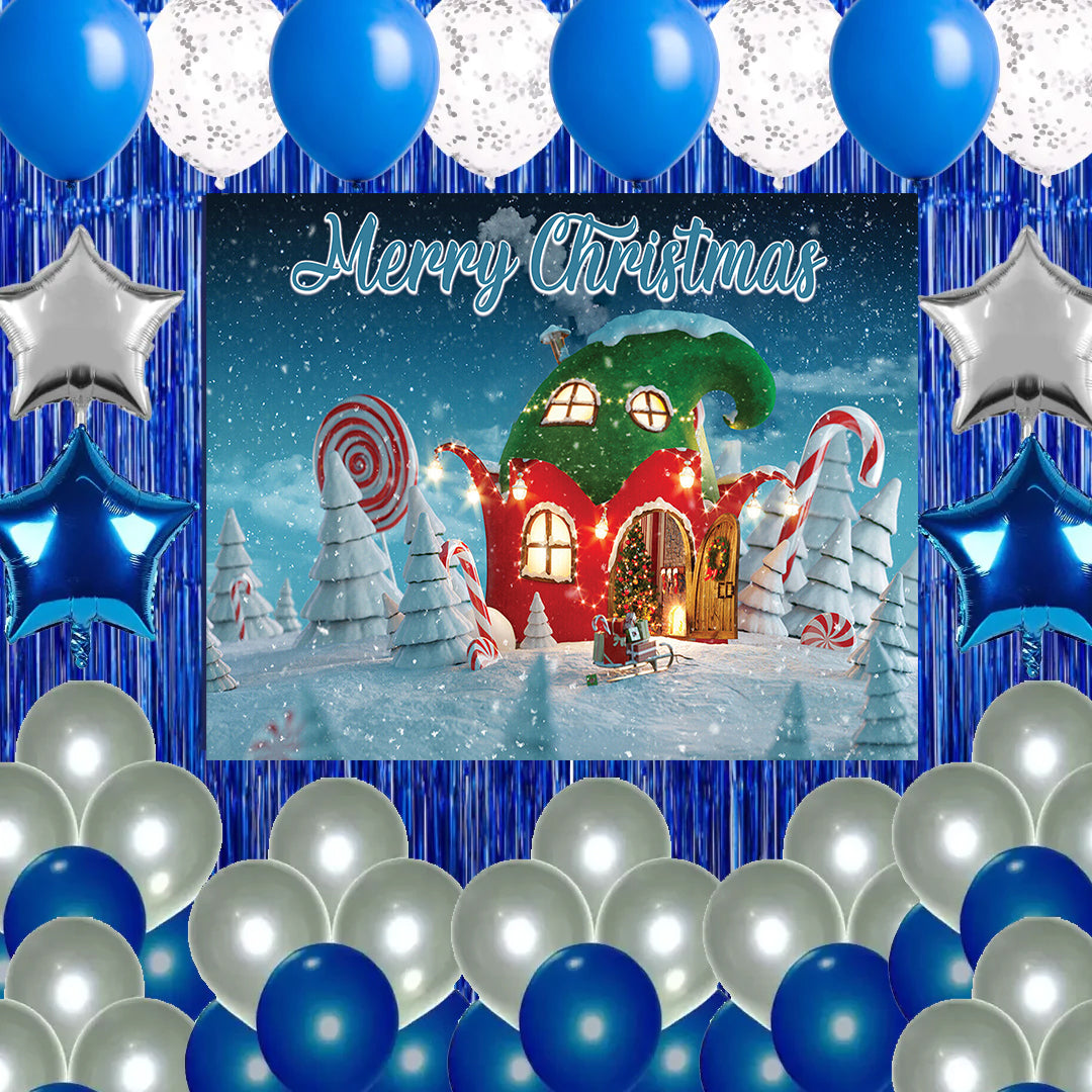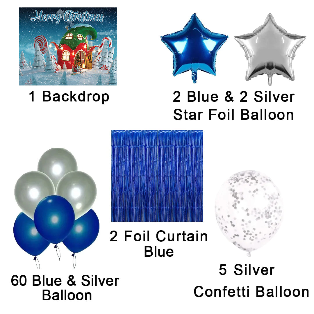 PACKAGE: 2 Pcs Blue Fringe curtains; 1 Christmas backdrop- Size 4 by 4 ft, 60 pc latex balloons Blue and silver 30 each); 5 pc silver confetti ,2 star Blue and 2 Silver star 18"inch.