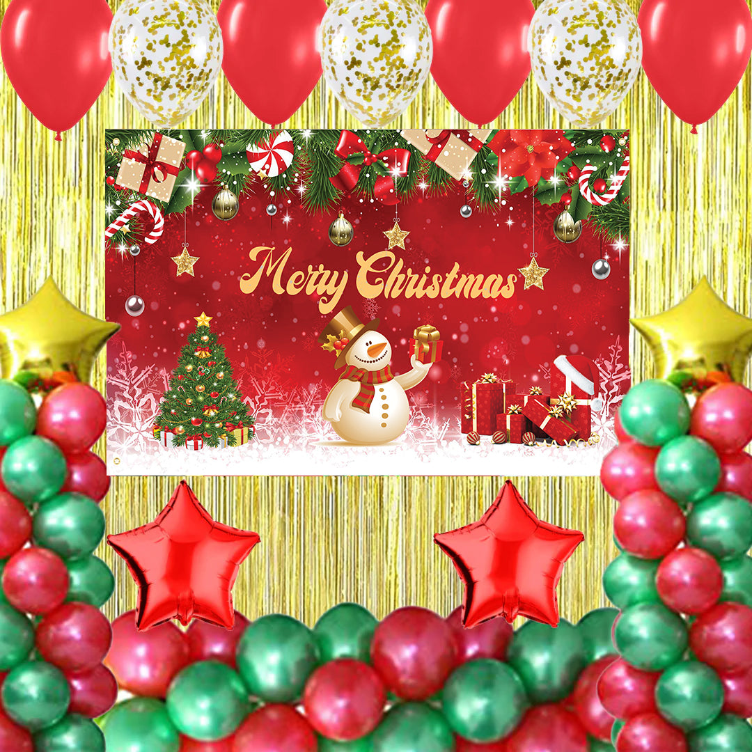 Package Includes -2 Pcs gold Fringe curtains; 1 Christmas backdrop- Size 4 by 4 ft, 60 pc latex balloons Red and green 30 each); 5 pc gold confetti ,2 star Red and 2 Gold star 18"inch.