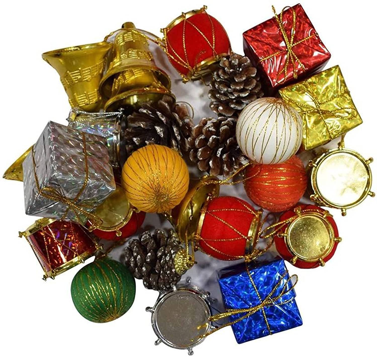 - Package Content: 24 mix decoration with Balls ( any color ) , bells ( silver or golden color ) ,gift boxes ,drum and pine decorations