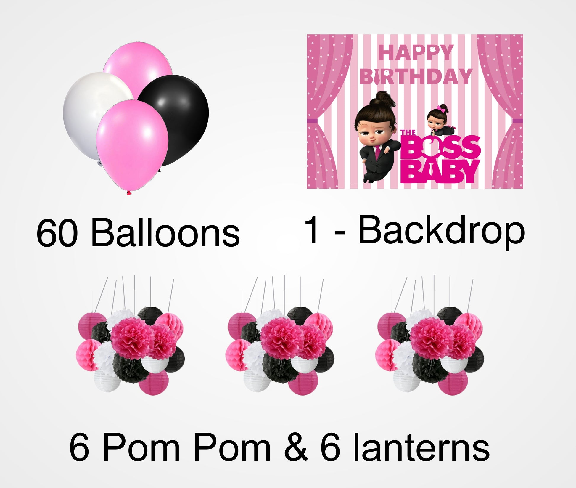 - Package includes -Boss baby themed birthday party supplies kit included Backdrop-flex material light and thin , Balloons- 60 pcs Latex gold quality 20 pc each pink, ,black and white and 6pc Pom Pom(2 pc each pink white and black ) and 6 pc paper Lantern (2 pc each pink ,black and White ) .All of the kit is useful for birthday party.