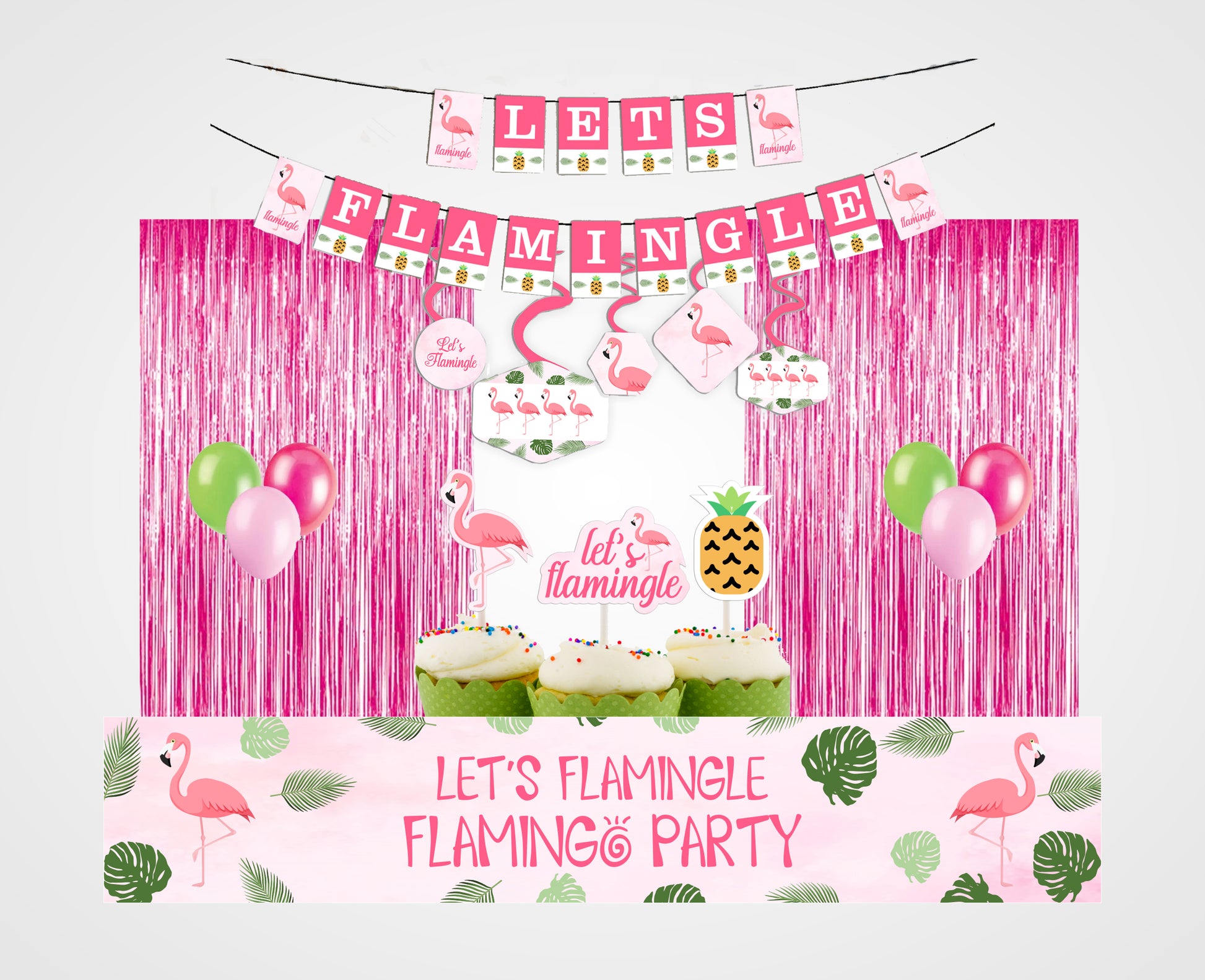 - Package Includes -Flamingo themed birthday party supplies kit included Happy Birthday” letter with banner, 6 pcs swirls hangings , two packs of pink foil fringe shiny curtain , 40 pcs latex balloons- light pink ,dark pink and green ,12 cup cake topper and long banner in front of table or wall decoration .All of the kit is useful for 1st birthday party.