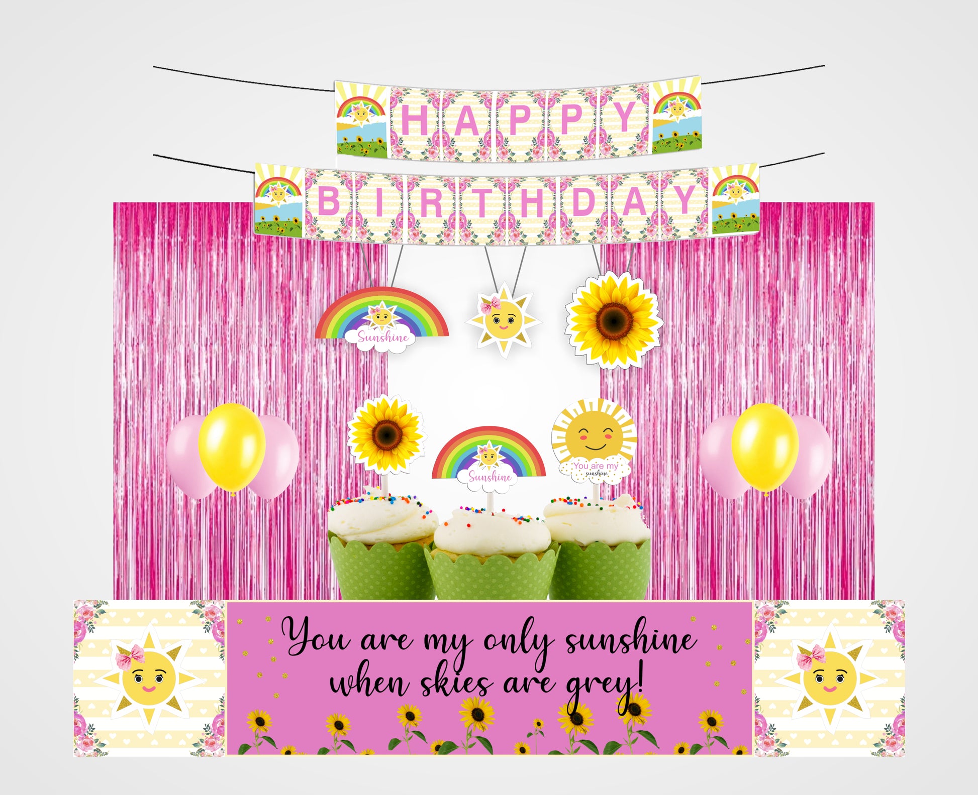 - Package Includes -"You are my sunshine" themed birthday party supplies kit included a “HAPPY BIRTHDAY” letter banner, 6 pcs swrils hangings , two packs of foil fringe shiny curtain , 40 pcs latex balloons ,12 cup cake topper and long banner in front of table or wall decoration .All of the kit is useful for jungle birthday party.