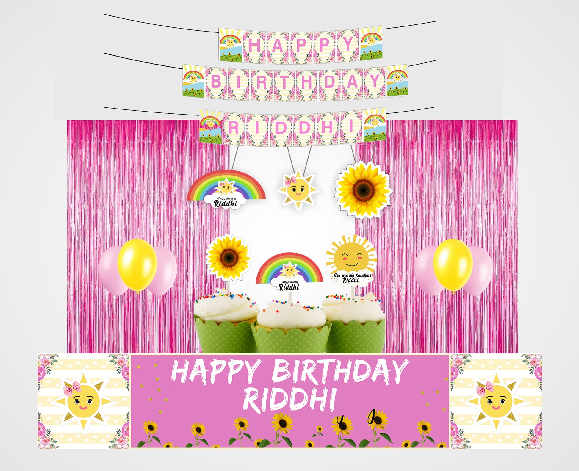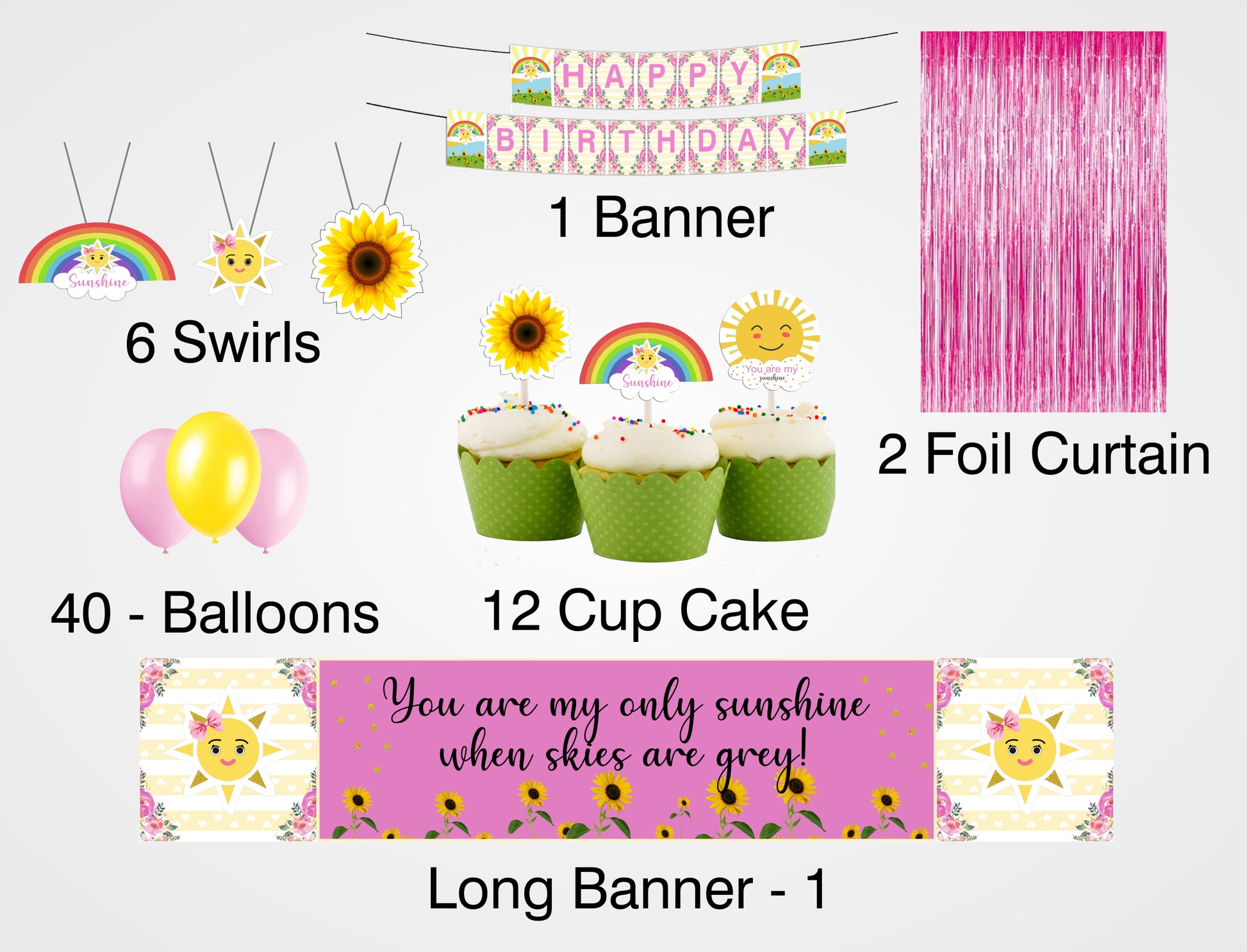 - Material -2 Foil Curtain -6 by 3 (height and width) shiny foil, long banner vinyl material, and size approx. Five by 1, Happy Sunshine Theme banner, Cupcake Topper & Hangings are made up of stiff paper. Tools like ribbon, glue dot, and swirls send along with it. Little assembly required.