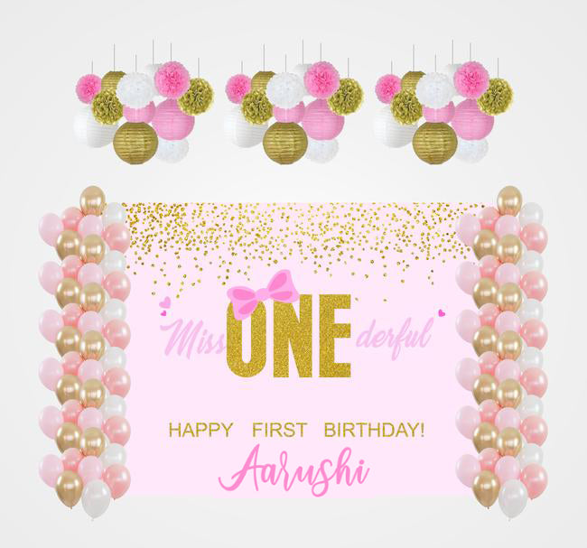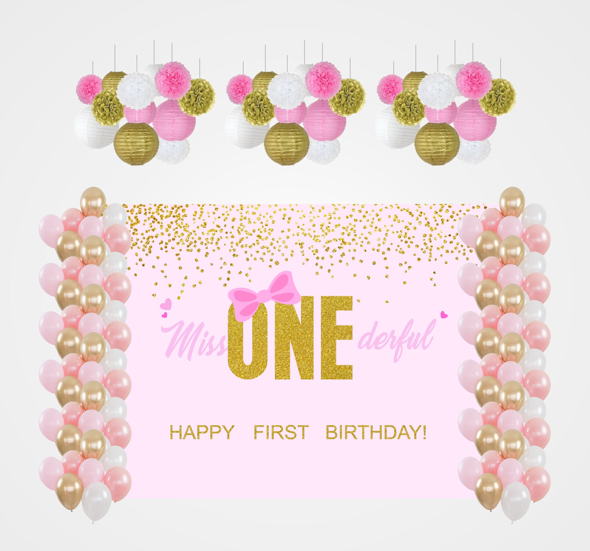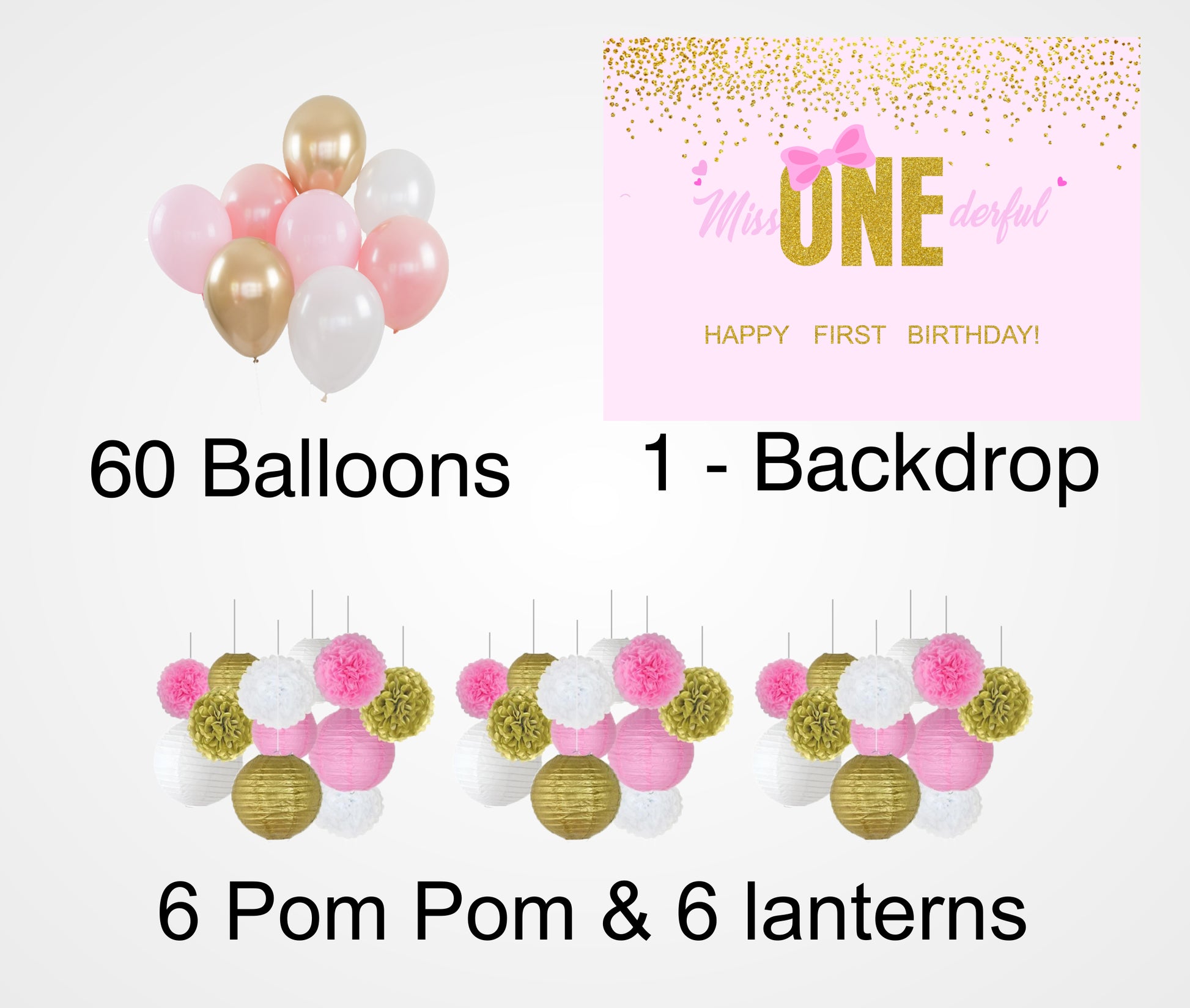 - Package includes - Backdrop-flex material light and thin, Balloons- 60 pcs Metallic 20 pc each pink gold white and six pc Pompom (2 each pink gold and white) and six pc paper Lantern (2 pc each pink gold and white). All of the kits are useful for First Birthday party.