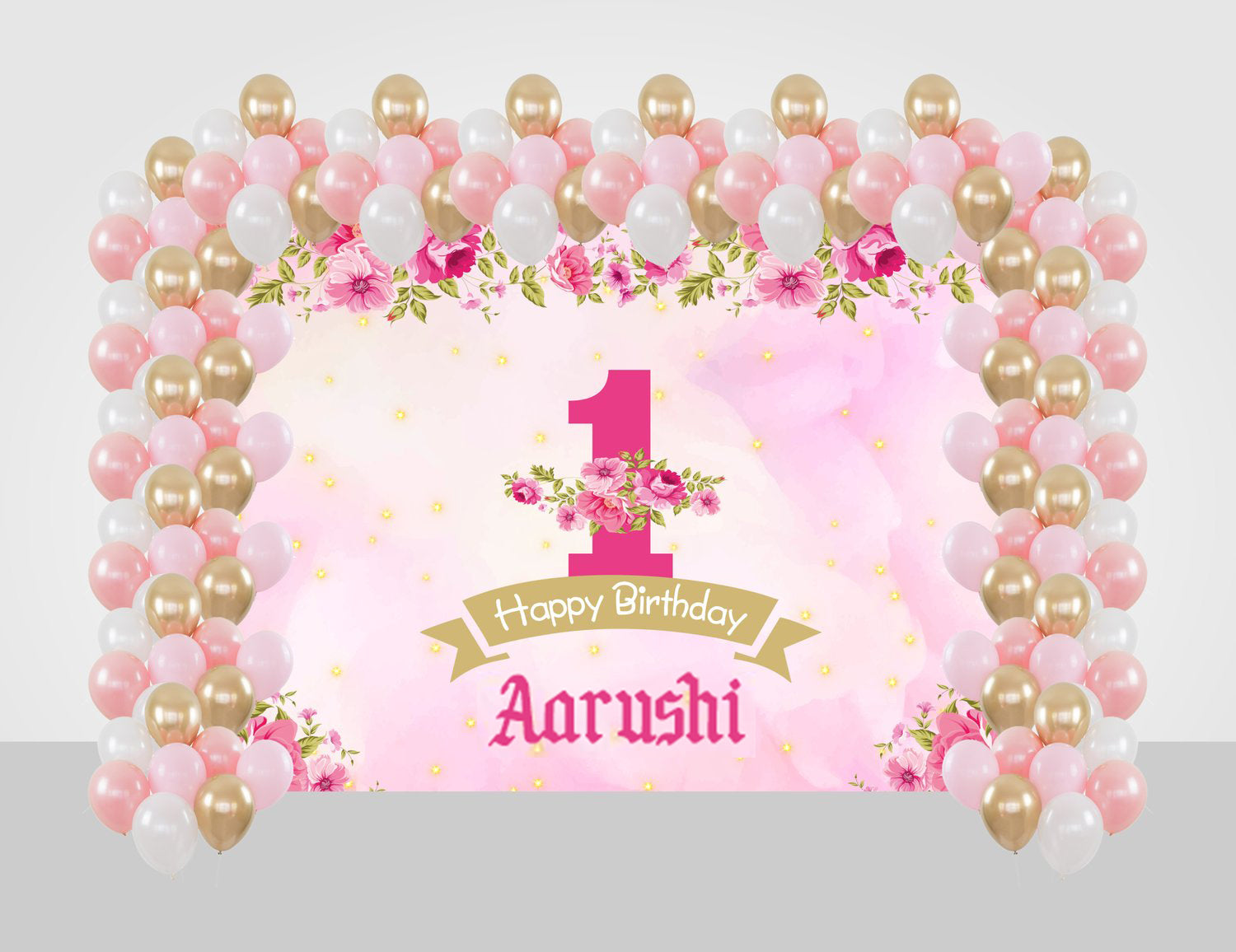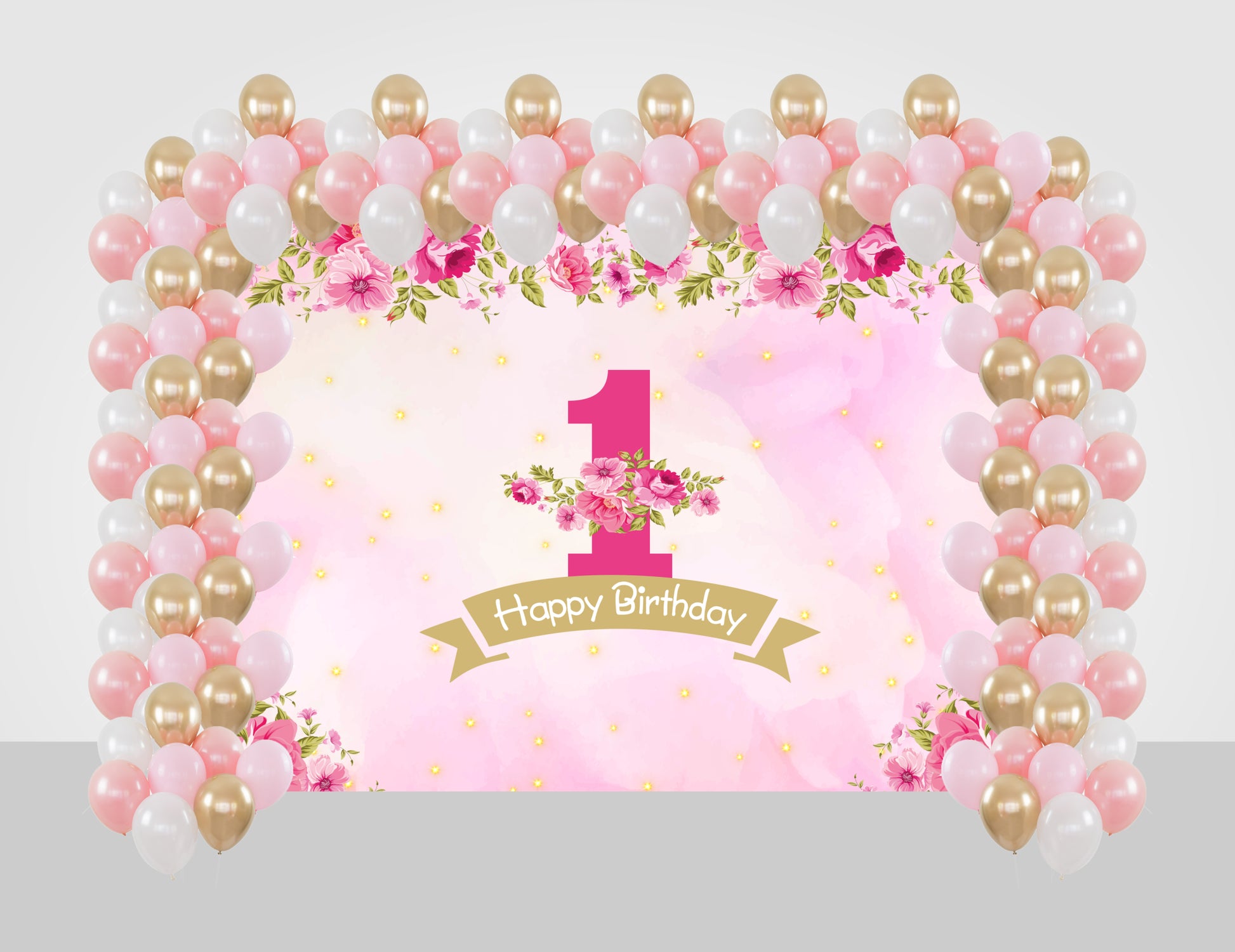 Package Includes - First Birthday Theme Backdrop & Balloons. Total 50 balloons, 17 each -pink ,gold and white.