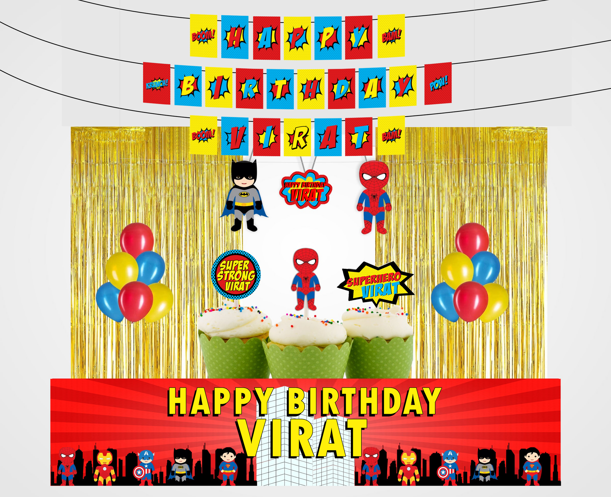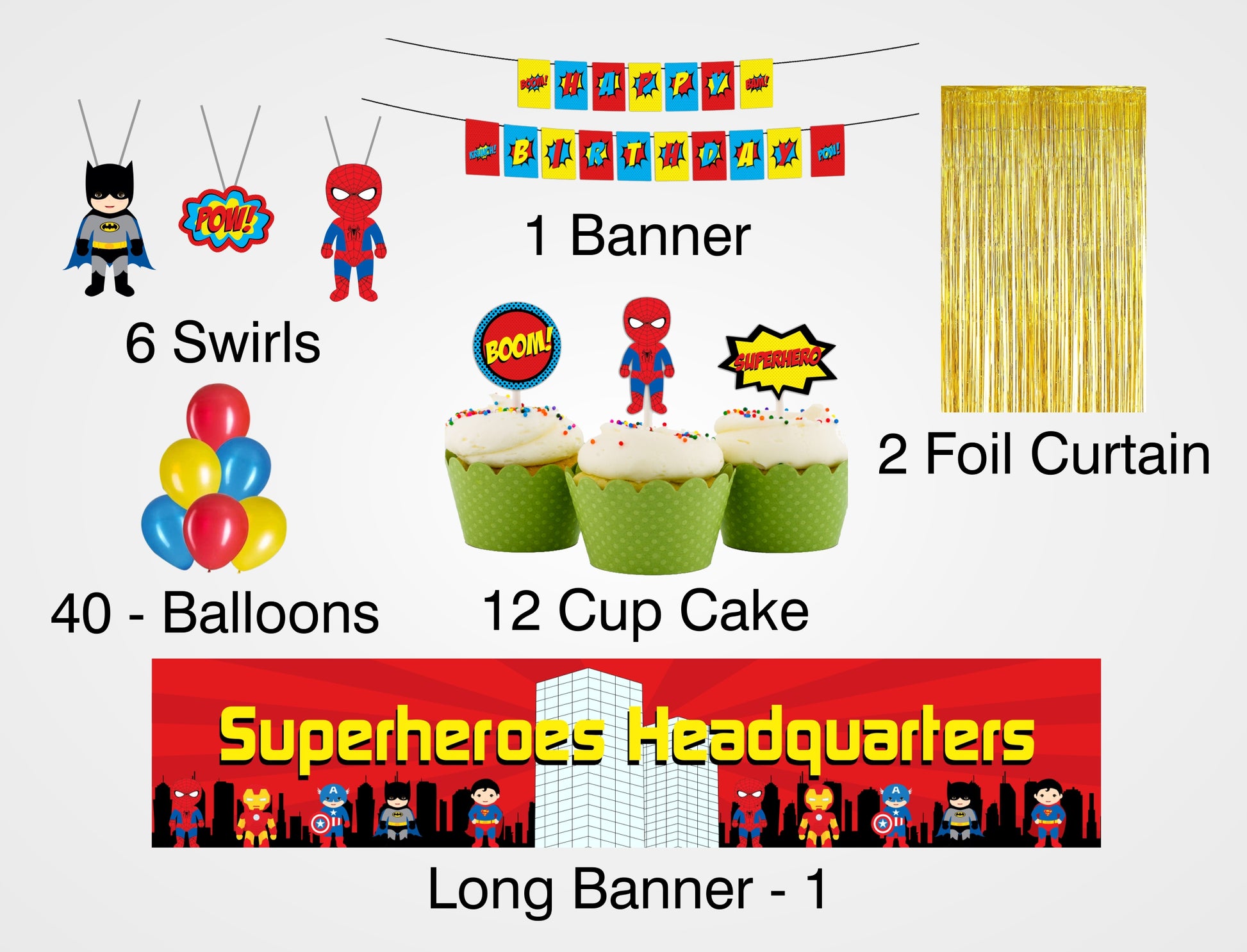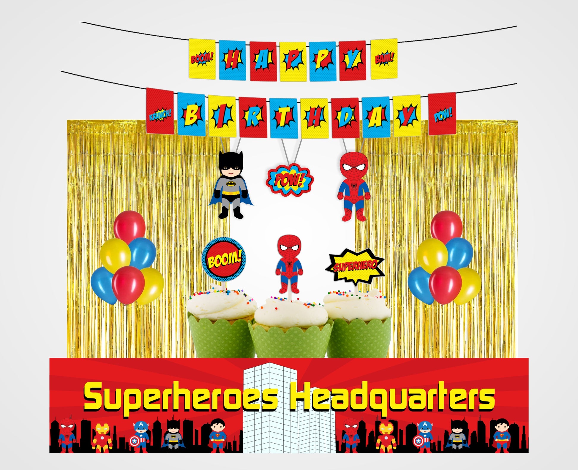 - PACKAGE CONTENT -Super Heroes themed birthday party supplies kit included a “HAPPY BIRTHDAY” letter with banner, 6 pcs swirls hangings , two packs of golden foil fringe shiny curtain 6 by 3 approx. , 40 pcs latex balloons- (Blue ,Red and Yellow ) ,12 cup cake topper and 1-long banner in front of table or wall decoration.