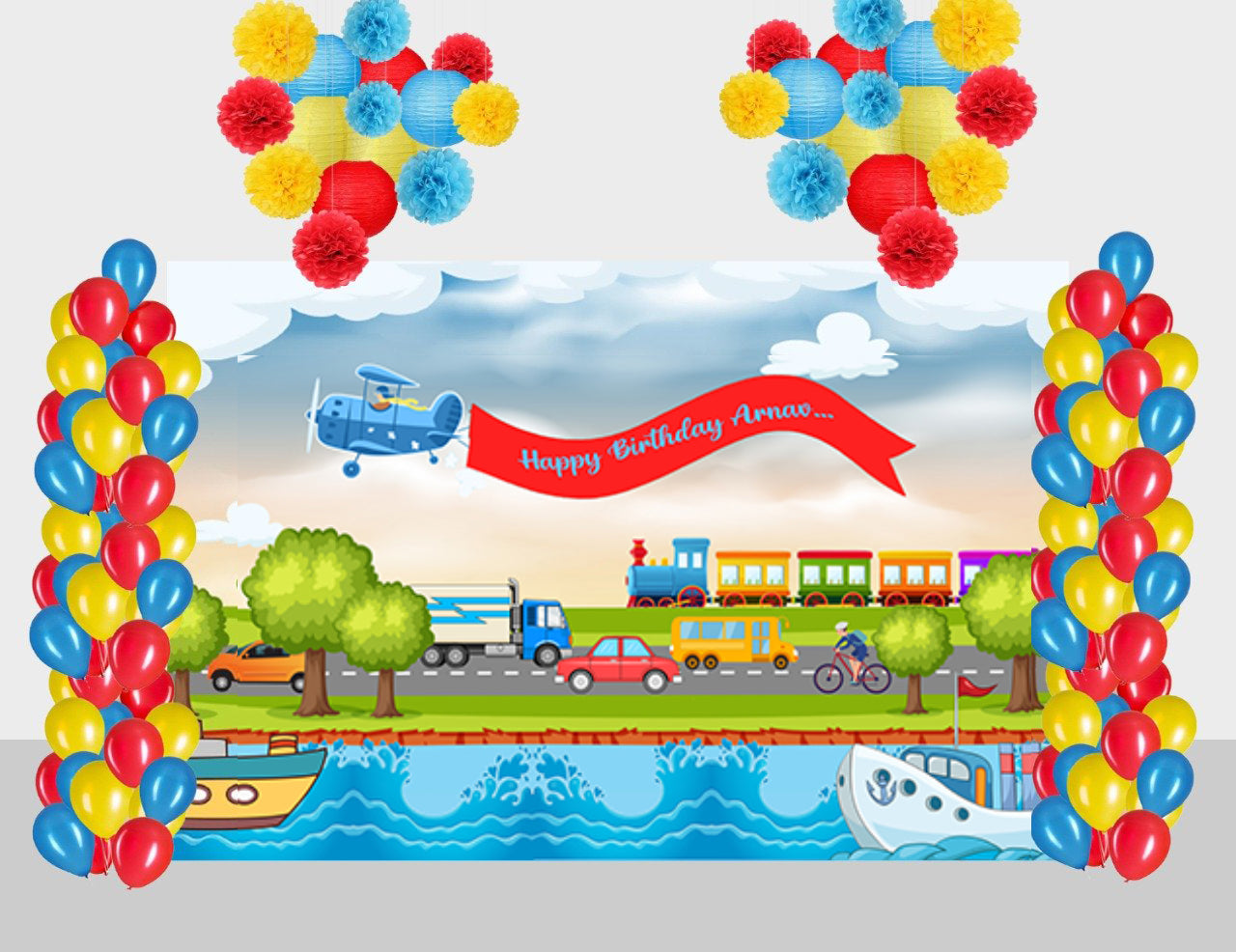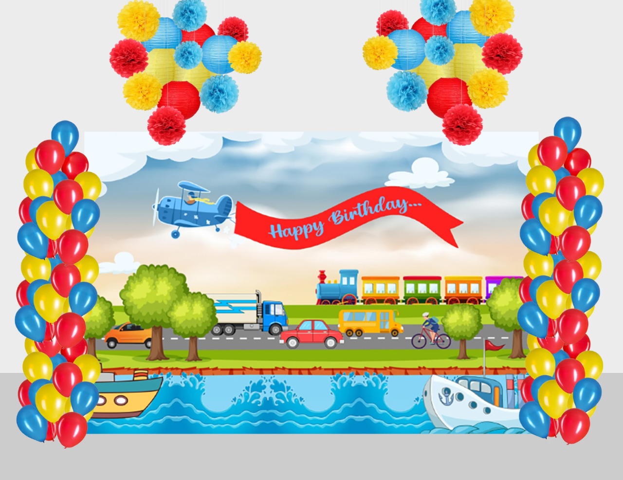 - PACKAGE CONTENT - Transport themed birthday party supplies kit included Backdrop-flex material light and thin , Balloons- 60 pcs multicolor balloons and 6pc Pom Pom and 6 pc paper Lantern Multicolor .All of the kit is useful for birthday party.