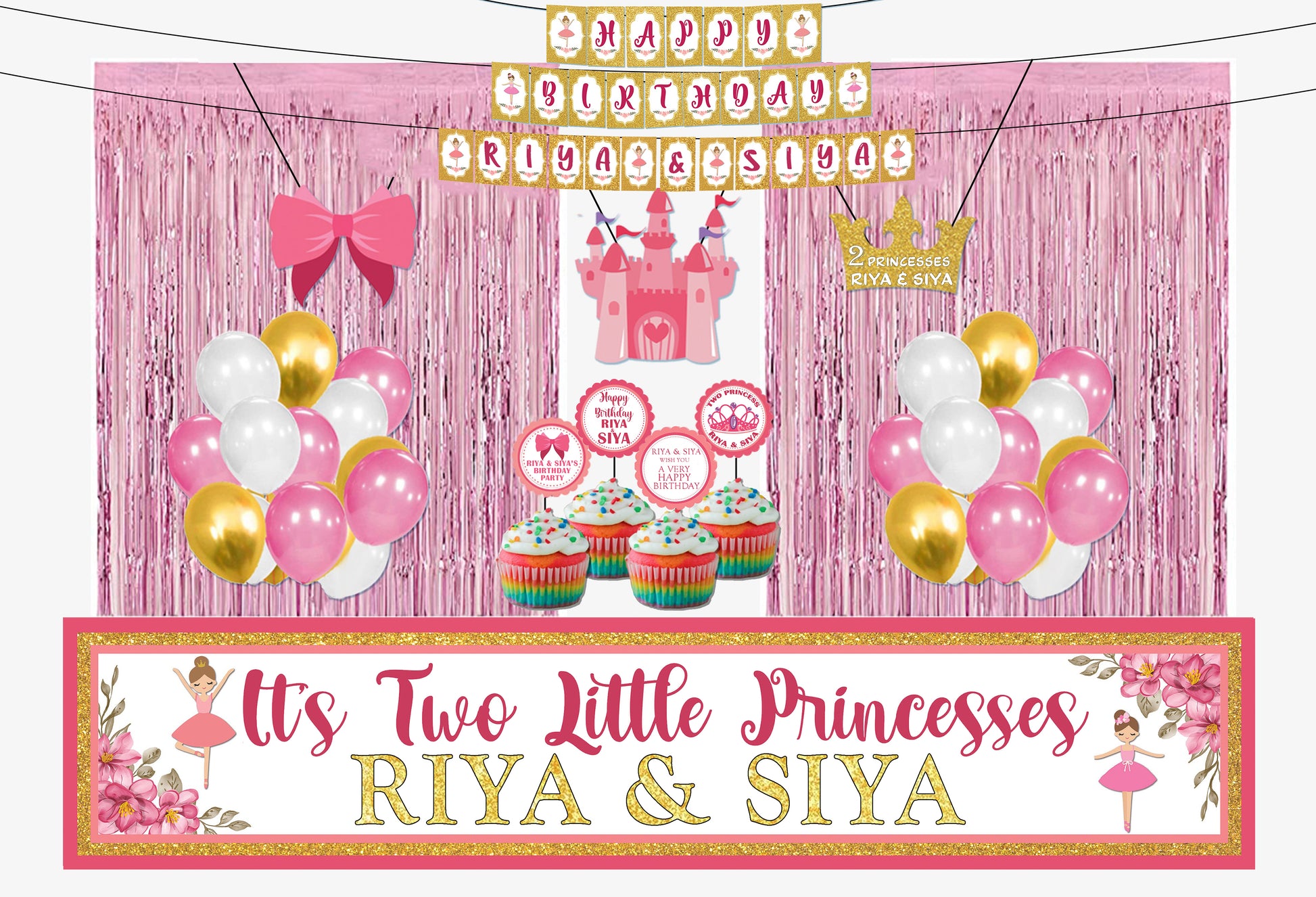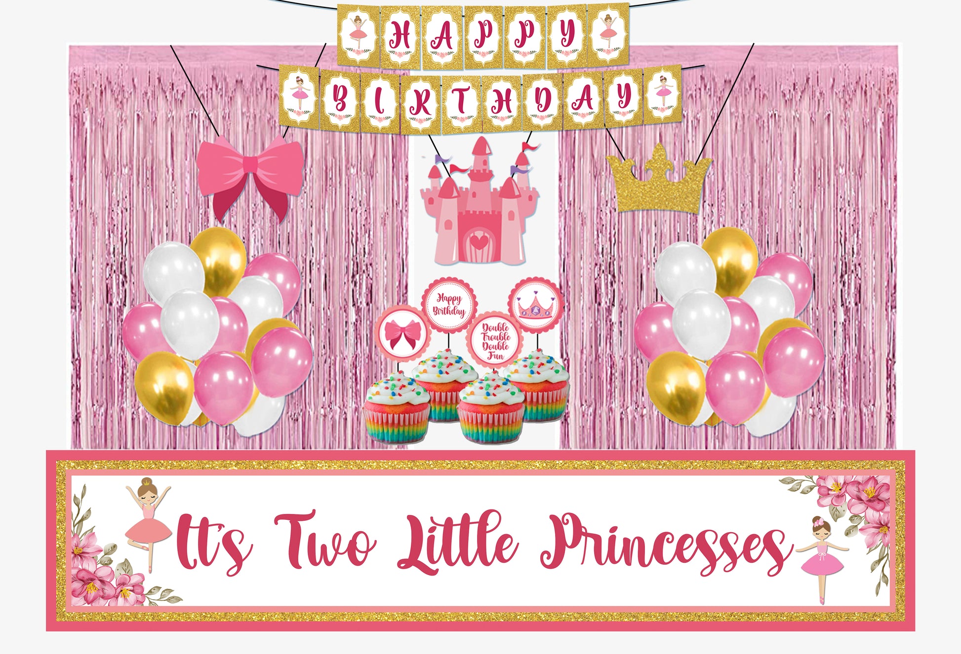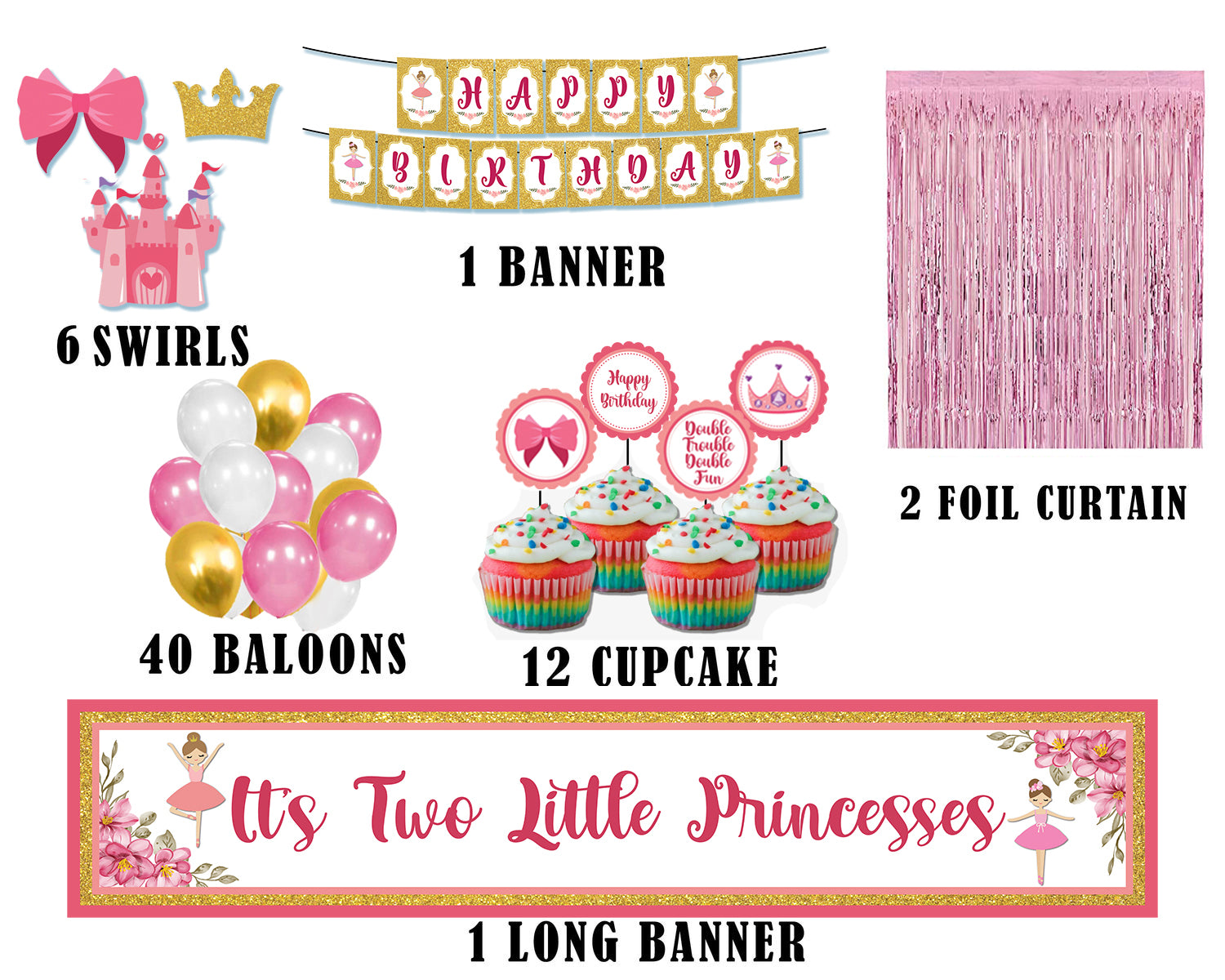 - Package Includes -Twin Girls themed birthday party supplies kit included a “Happy Birthday ” letter banner, 6 pcs swrils hangings , two packs of pink foil fringe shiny curtain , 40 pcs latex balloons- gold white and pink ,12 cup cake topper and long banner in front of table or wall decoration. All of the kit is useful for 1st birthday party.
