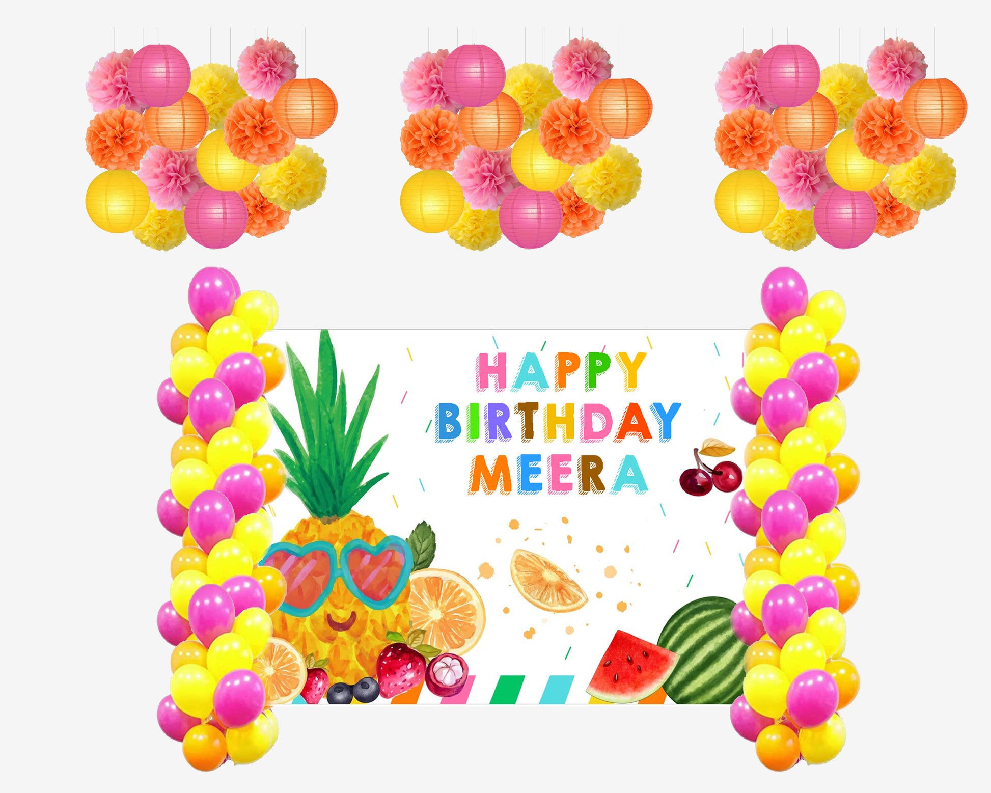 Package includes - Twotti fruity themed birthday party supplies kit included Backdrop-flex material light and thin , Balloons- 60 pcs Latex gold quality 20 pc each pink, orange and white and 6pc Pom Pom(2 pc each pink, orange and yellow) and 6 pc paper Lantern (3 pc each pink , orange and yellow ) .All of the kit is useful for birthday party.