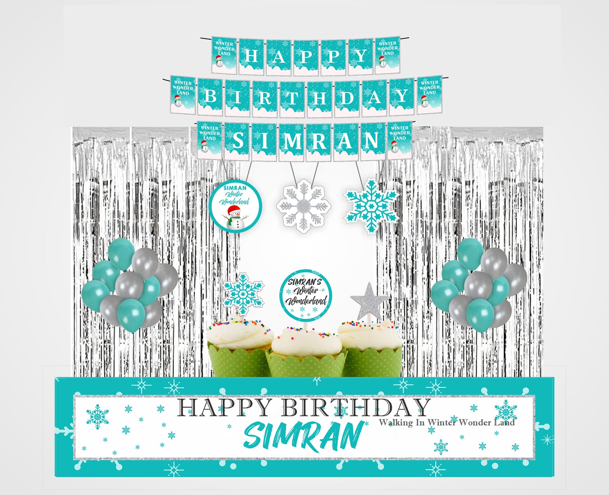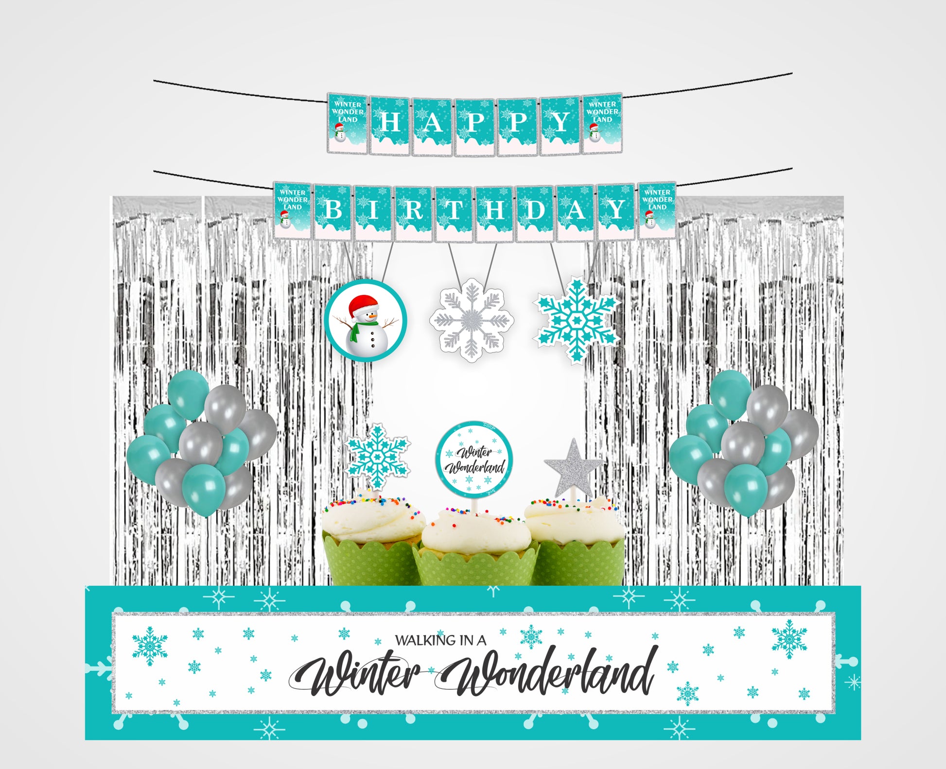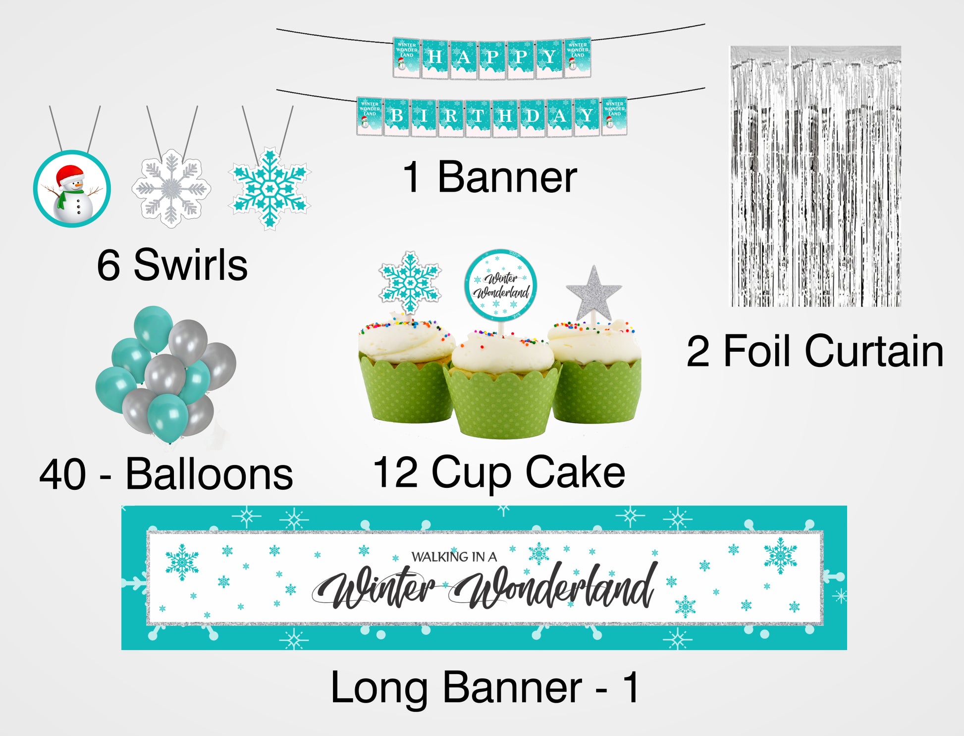 - Package Includes -Winter wonderland themed birthday party supplies kit included a “HAPPY BIRTHDAY” letter banner, 6 pcs swirls Hangings , two packs of foil fringe shiny curtain , 40 pcs latex balloons ,12 cup cake topper and long banner in front of table or wall decoration .All of the kit is useful for winter wonderland birthday party.