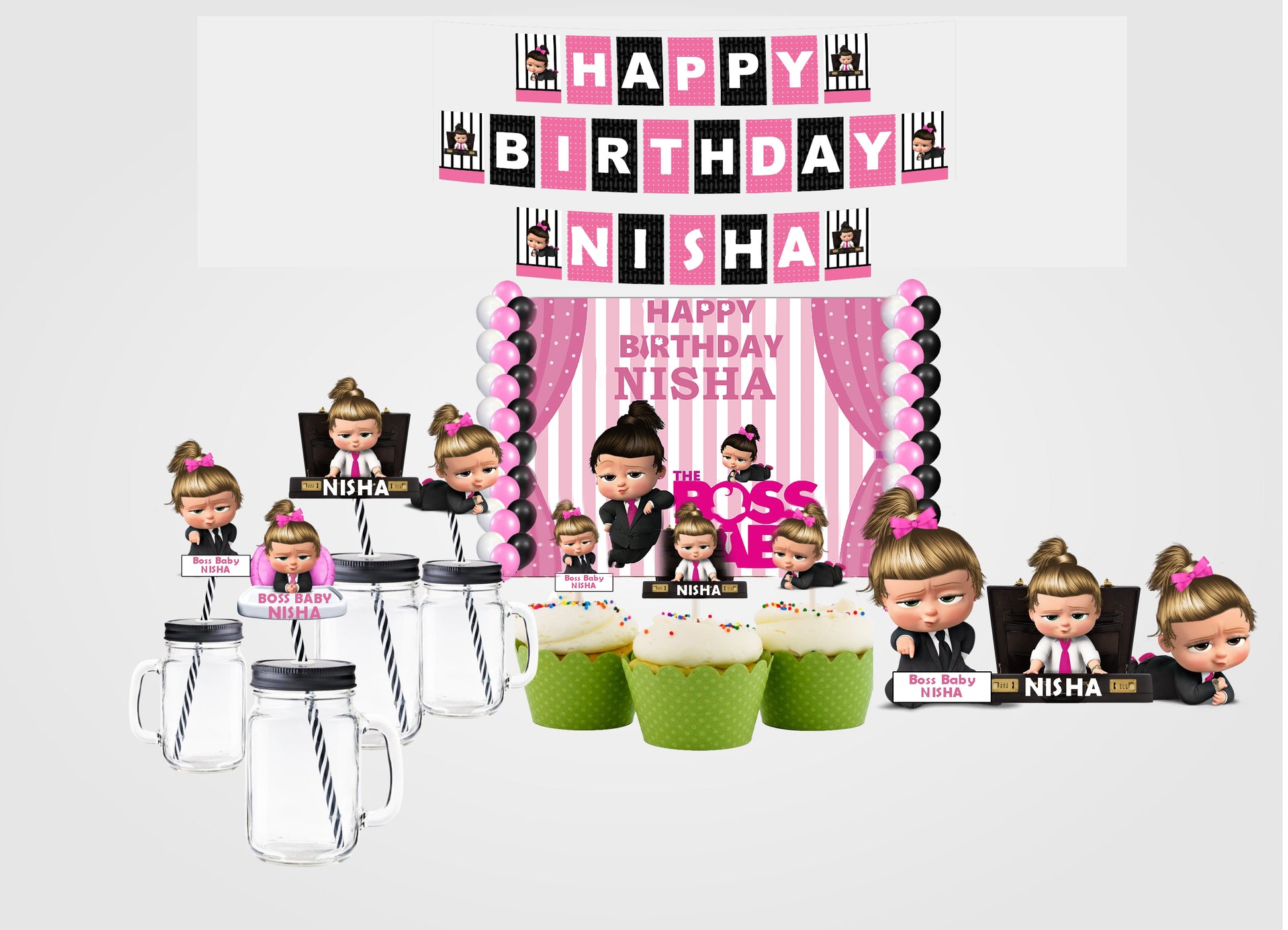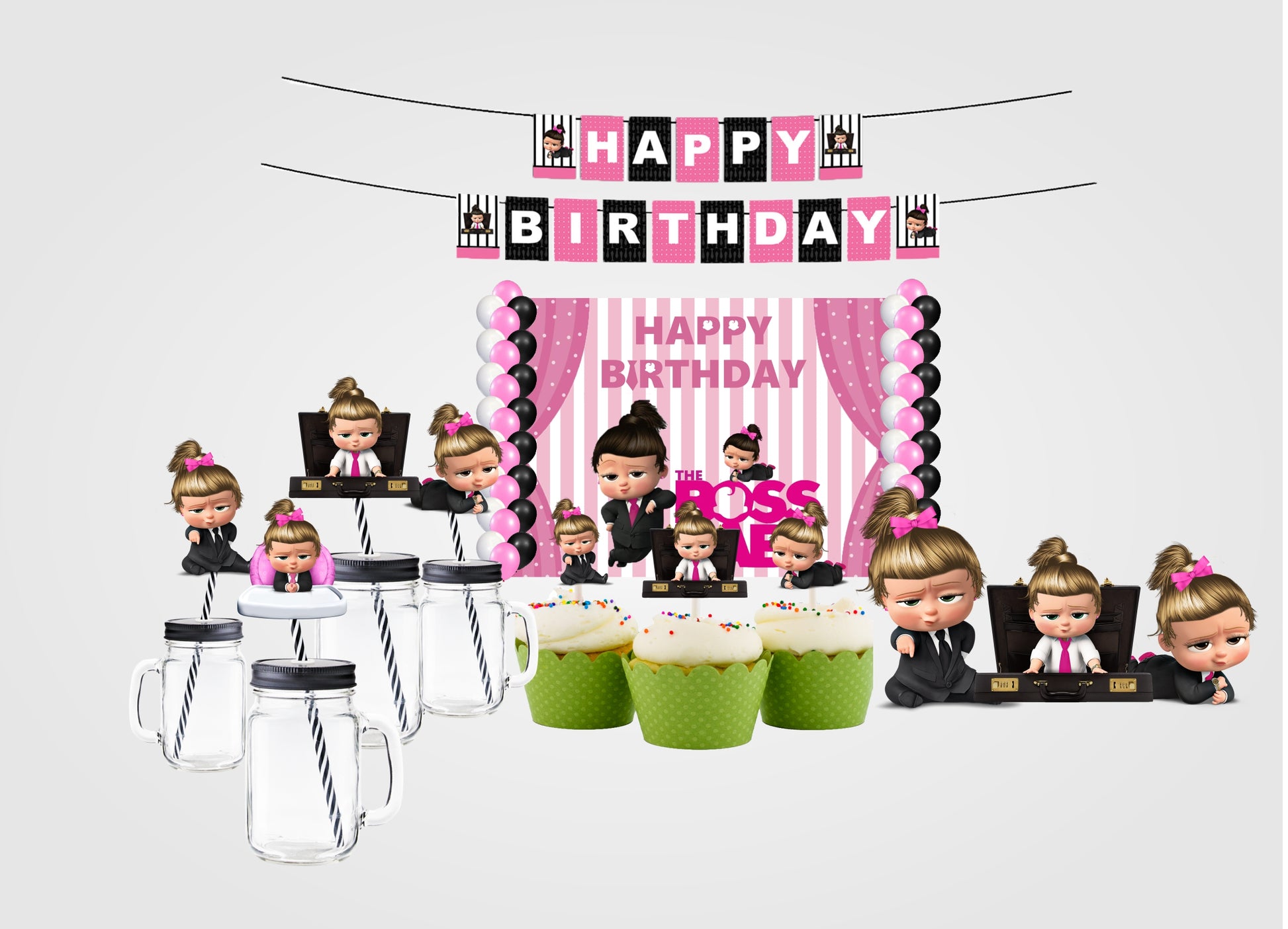 - Package Includes - Boss Baby themed birthday party supplies kit included Backdrop-flex material light and thin , Balloons- 40 pcs Latex gold quality 14 pc each pink black and white and 1 Banner Happy Birthday,3 Cutouts Theme Based, 25 Straw ,6 Confetti and 12 Cup Cake all theme Based All of the kit is useful for 1st birthday party.