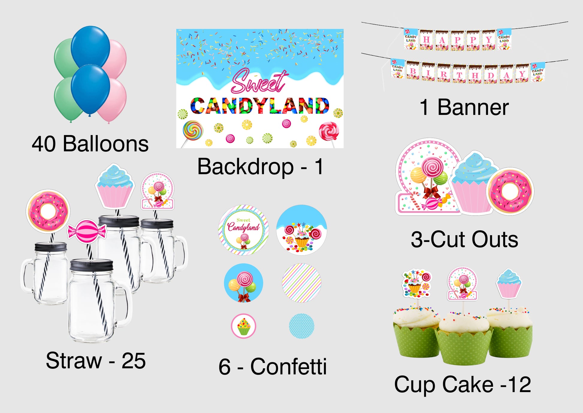 - Package Includes - Candyland themed birthday party supplies kit included Backdrop-flex material light and thin , Balloons- 40 pcs Latex gold quality 14 pc each light pink ,blue and green and 1 Banner Happy Birthday, 3 Cutouts Theme Based, 25 Straw and 12 Cup Cake all theme Based All of the kit is useful for birthday party.