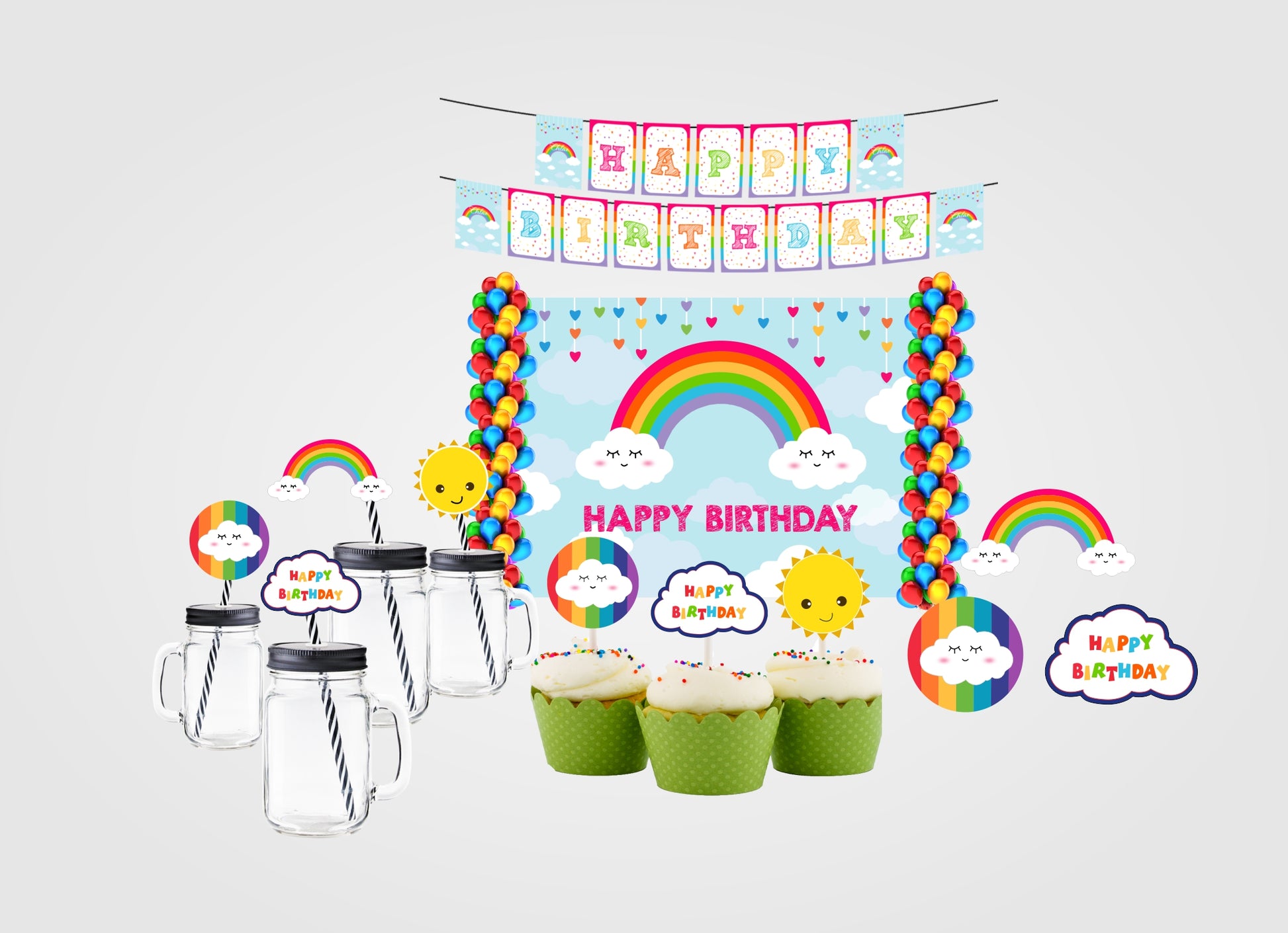 Rainbow Theme Birthday Complete Party Kit with Backdrop & Decorations