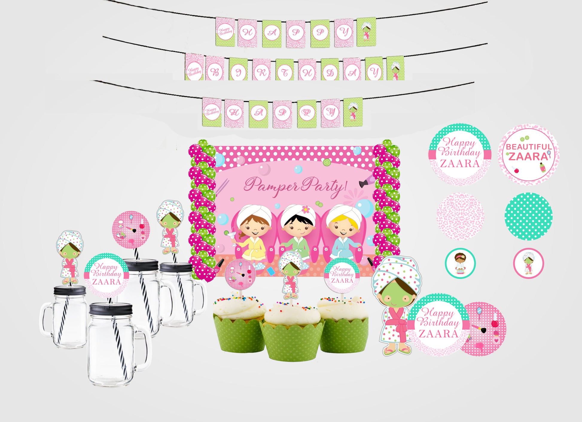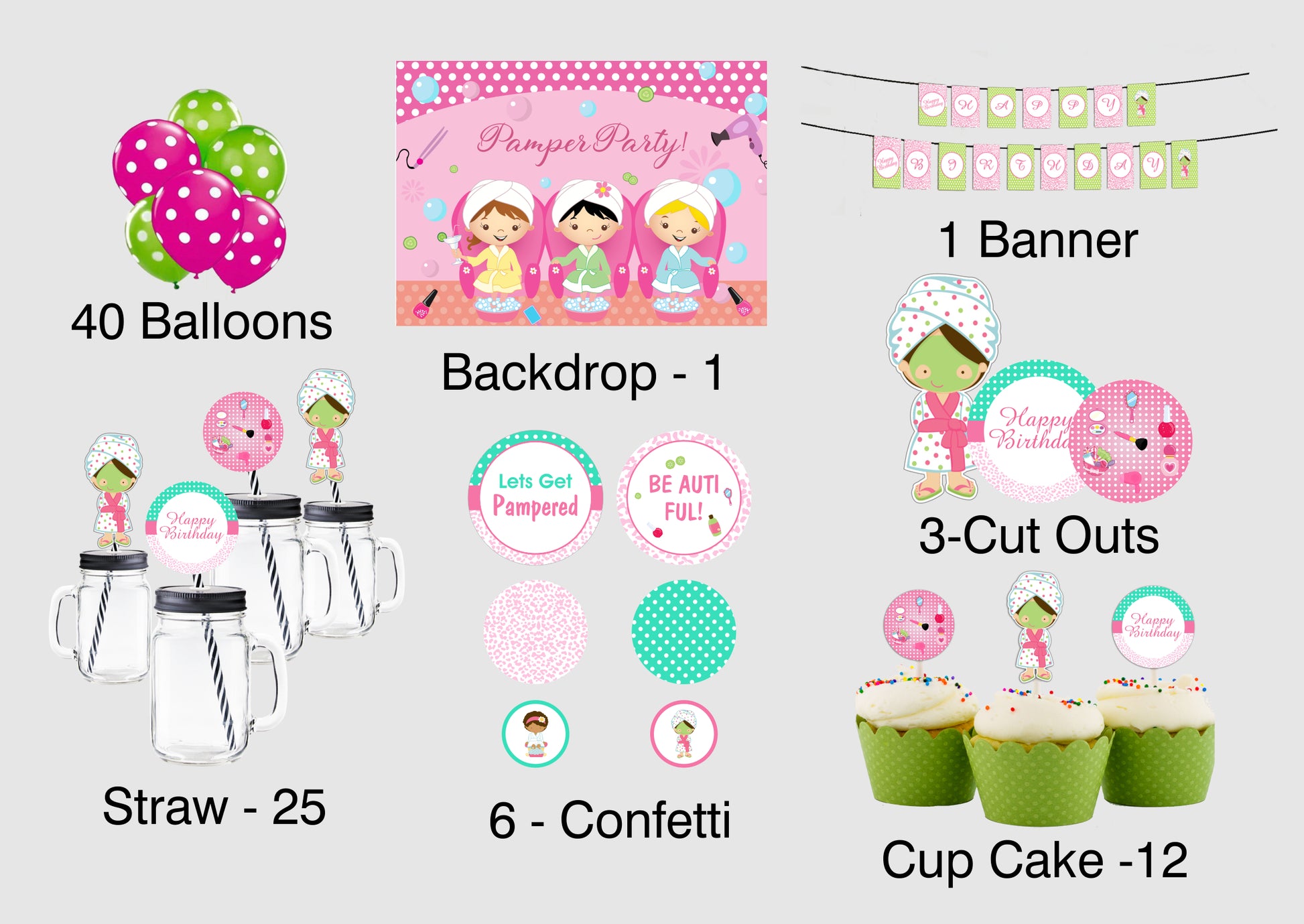- Package Includes - Spa themed birthday party supplies kit included Backdrop-flex material light and thin , Balloons- 40 pcs Latex gold quality 20 pc pink polka and 20 green and Banner Happy Birthday,3 Cutouts Theme Based, 25 Straw and 12 Cup Cake all theme Based All of the kit is useful for birthday party.