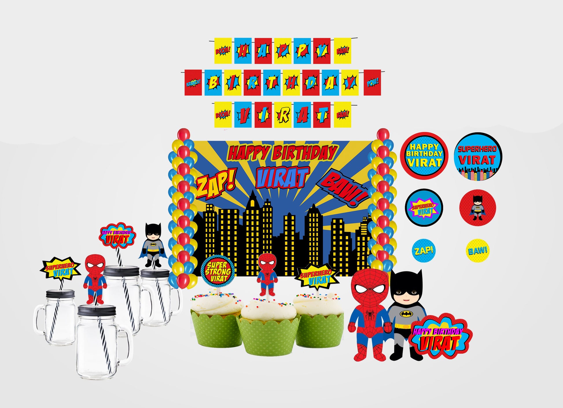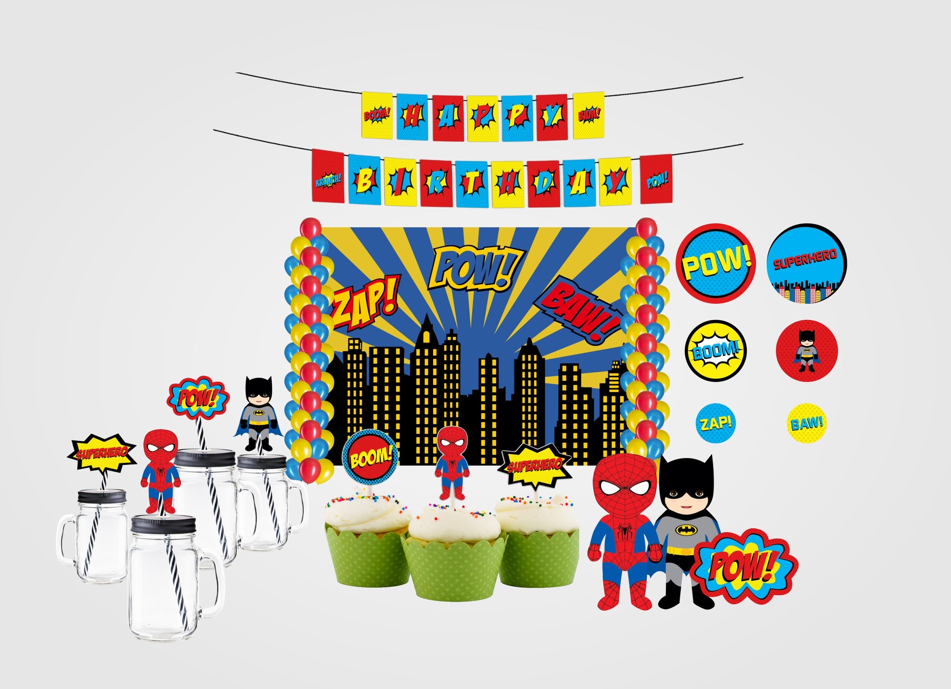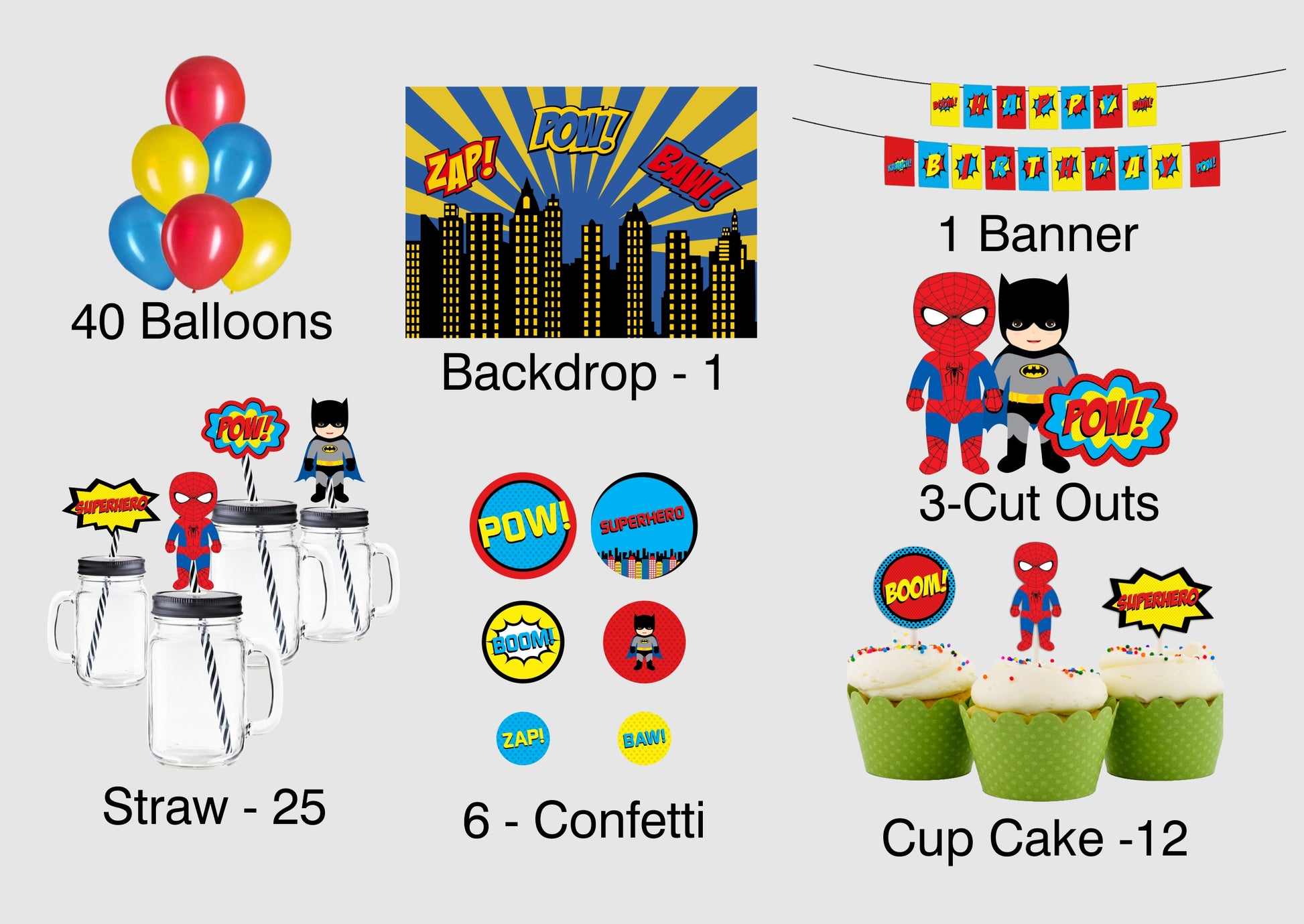 - PACKAGE CONTENT -Super Hero themed birthday party supplies kit included Backdrop-flex material light and thin , Balloons- 40 pcs Latex gold quality 14 pc each Red Blue and Yellow and 1 Banner Happy Birthday,3 Cutouts Theme Based, 25 Straw and 12 Cup Cake all theme Based All of the kit is useful for birthday party..