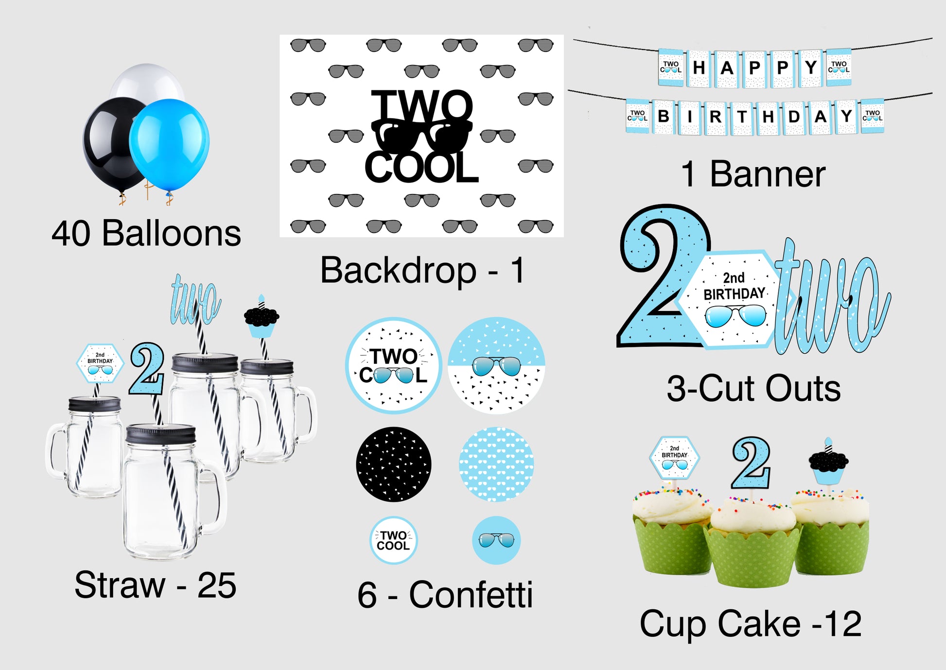 - PACKAGE CONTENT - Two Cool themed birthday party supplies kit included Backdrop-flex material light and thin , Balloons- 40 pcs Latex gold quality 14 pc each blue black and white and 1 Banner Happy Birthday,3 Cutouts Theme Based, 25 Straw ,6 Confetti and 12 Cup Cake all theme Based All of the kit is useful for 2nd birthday party.