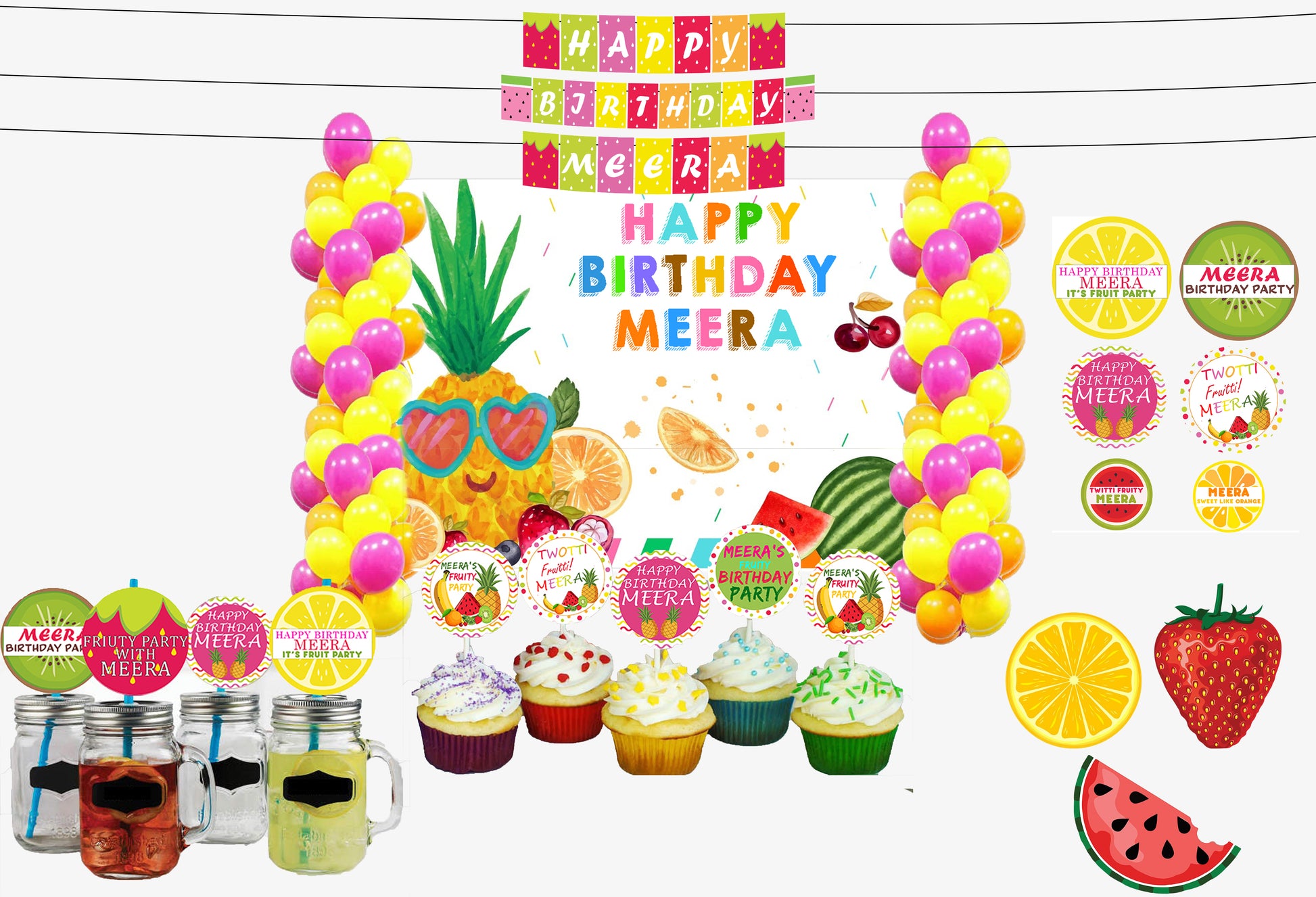Package Includes - Twotti fruity themed birthday party supplies kit included Backdrop-flex material light and thin , Balloons- 40 pcs Latex gold quality 14 pc each orange pink and pink and 1 Banner Happy Birthday,3 Cutouts Theme Based, 25 Straw ,6 Confetti and 12 Cup Cake all theme Based All of the kit is useful for 1st birthday party.