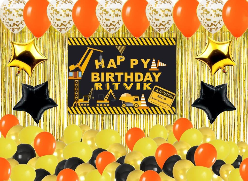 - Package Includes -3 Pcs golden Fringe Curtains, Backdrop - 4 by 4 ft, 60 pc Latex balloons (orange, yellow and black - 20 each), five pc glolden confetti, two golden star and two black star 18" inch each.