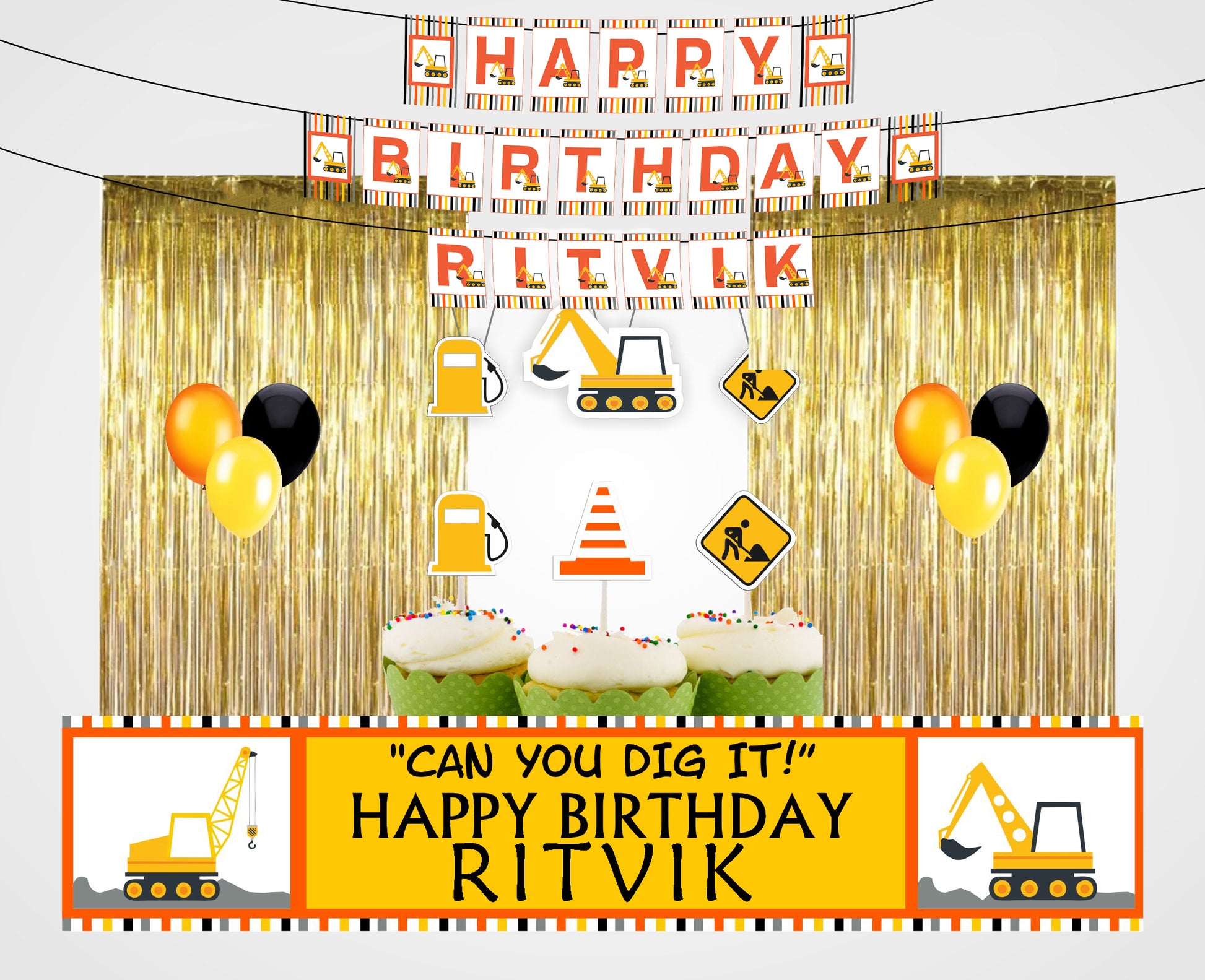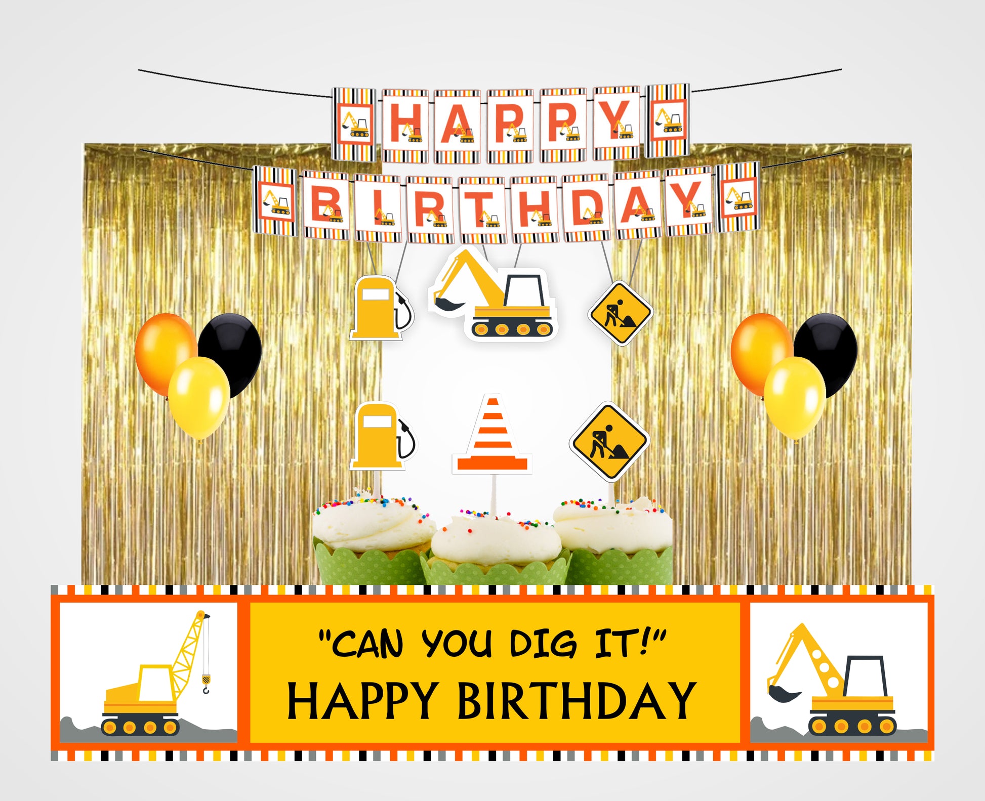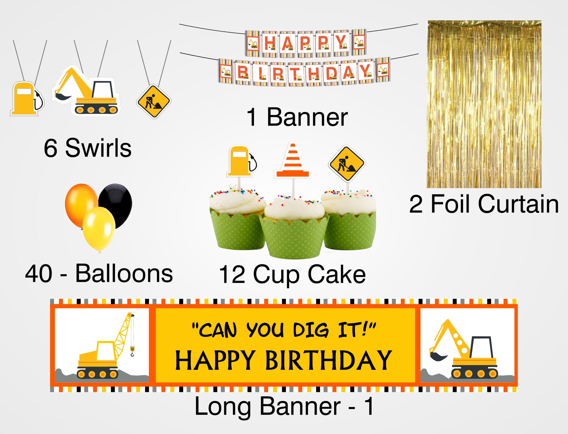 - Package Includes - 1 happy birthday letter banner, 6 pcs Swirls hangings,2 pcs golden Foil Fringe Shiny Curtain, 40 pcs Latex Balloons- black, yellow and orange ,12 cupcake topper and long banner. All of the kits are useful for Construction Birthday Party decorations.