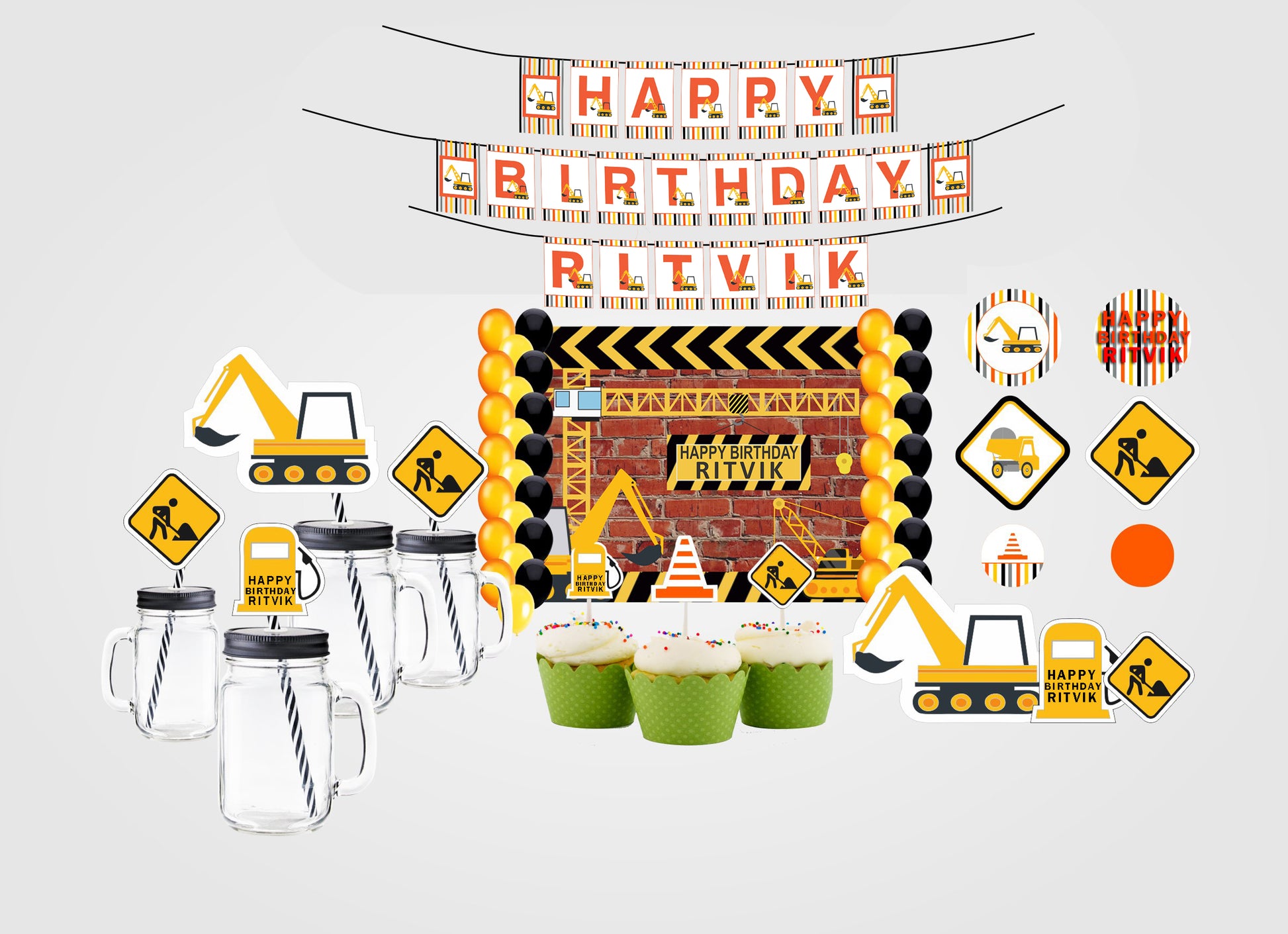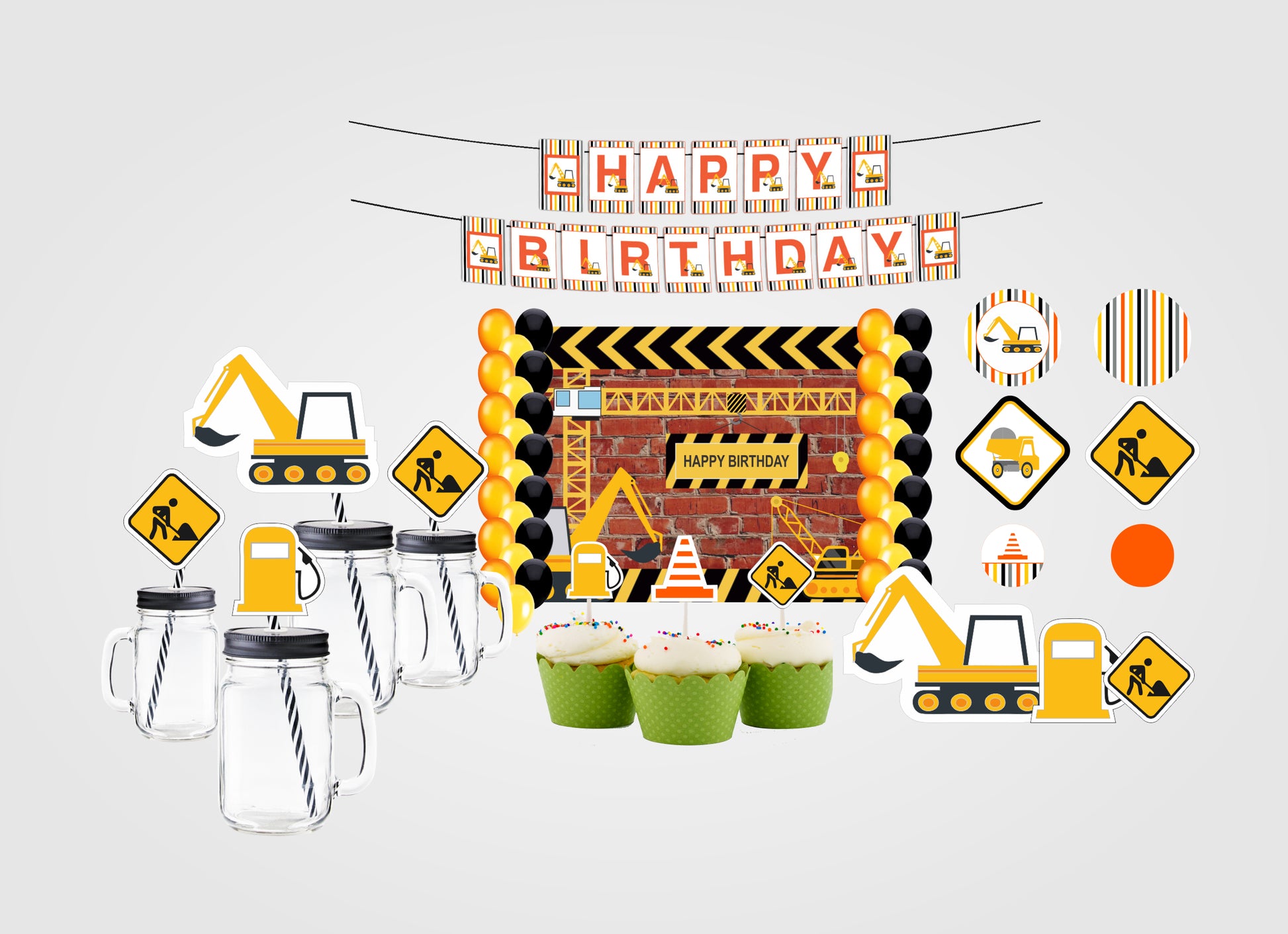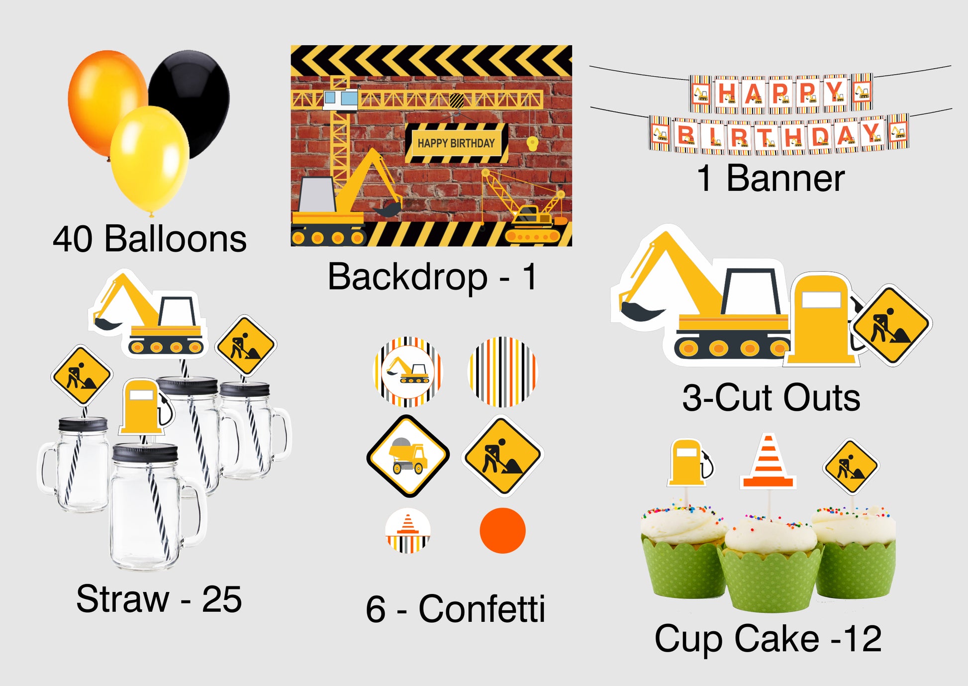 - PACKAGE CONTENT - Construction themed birthday party supplies kit included Backdrop-flex material light and thin , Balloons- 40 pcs Latex gold quality 20 pc each orange, yellow and black and 1 Banner Happy Birthday,3 Cutouts Theme Based, 25 Straw ,6 Confetti and 12 Cup Cake all theme Based All of the kit is useful for 1st birthday party.