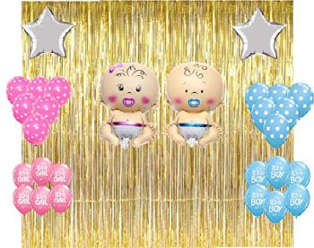 - Package includes - Fringe Curtain -2 golden shimmer curtains .Boy Shape Or Girl Shape foil balloon -1 each .Comes uninflated. Its a boy and its a girl pink and blue -10 latex balloons ,10 Blue polka and Pink polka balloons . 2 Star silver foil balloons .