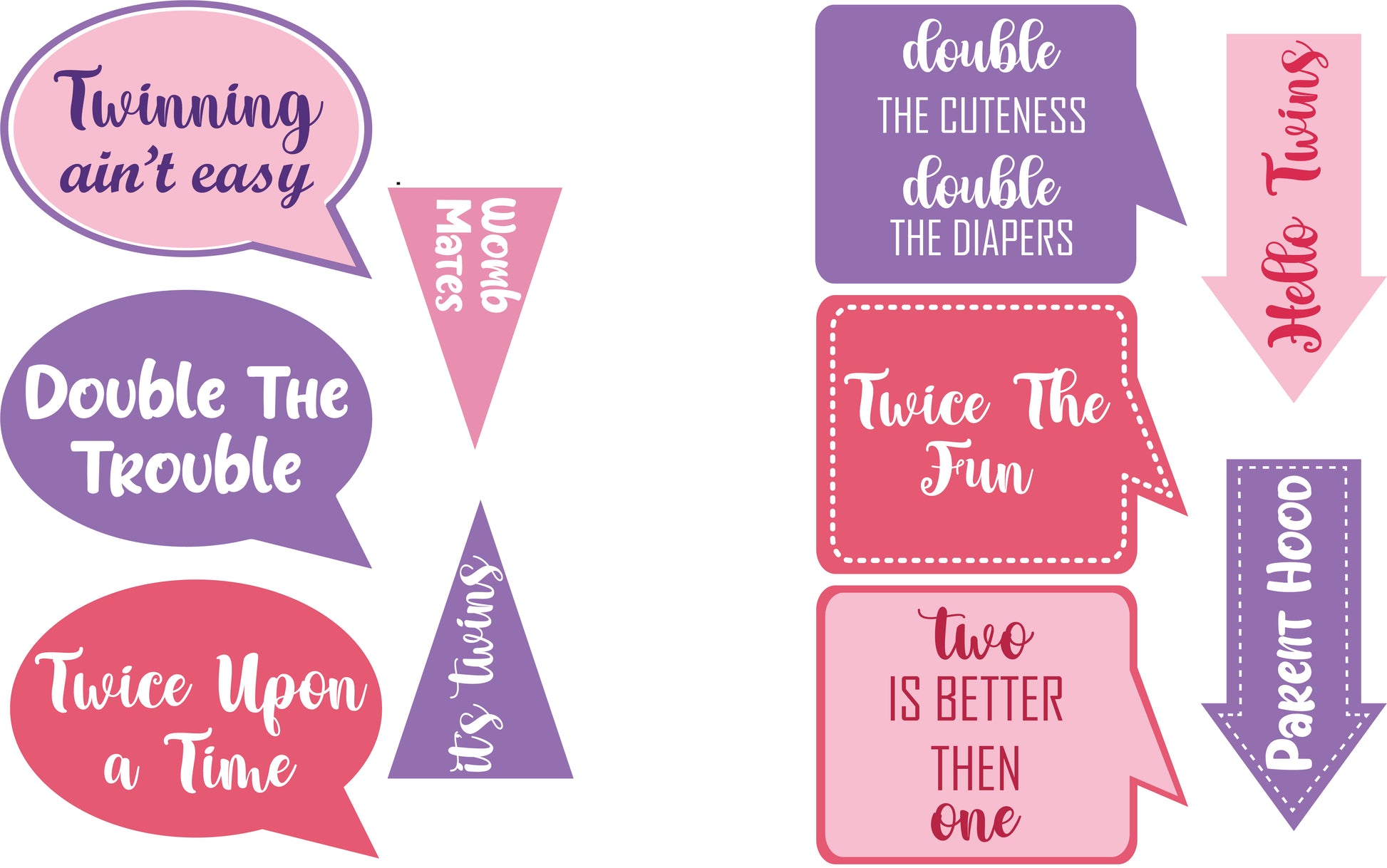 - Twin Girls Theme photo prop pack accompanies ten pieces and will add fun for kids and adults. Take entertaining party photos while making memories with these photo booth props. Everyone will adore the fun photographs they will make with these excellent props.