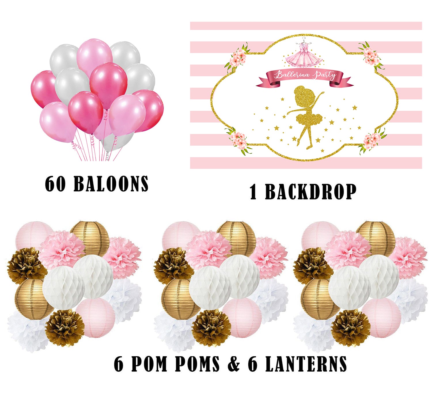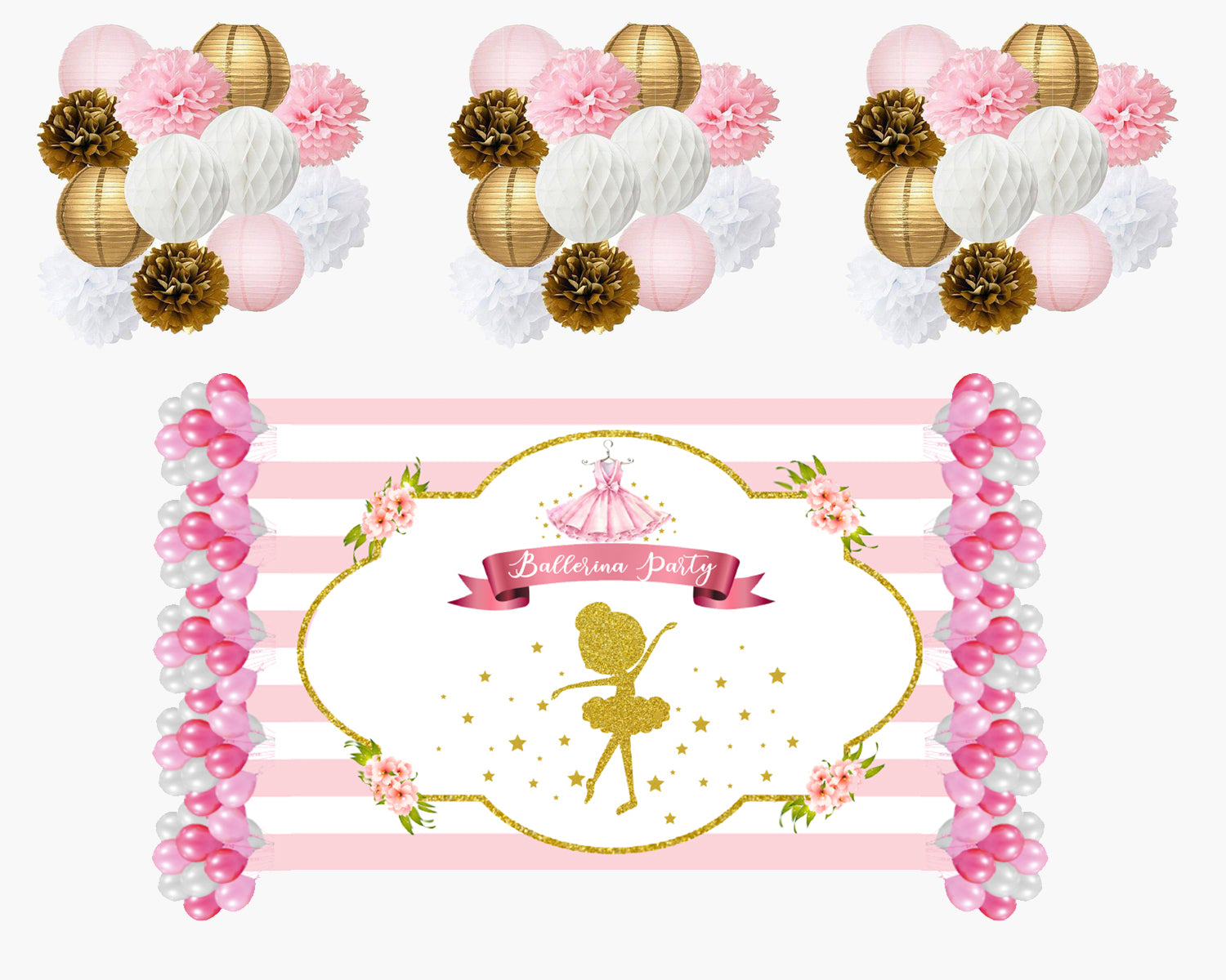 - Package includes - Tutu themed birthday party supplies kit included Backdrop-flex material light and thin , Balloons- 60 pcs Latex gold quality 20 each dark pink,light pink and white and 6pc Pompom(white gold pink -2 each ) and 6 pc paper Lantern 3 each pink gold and white