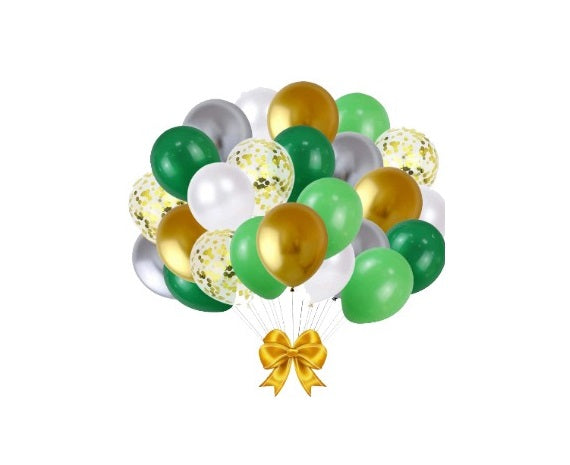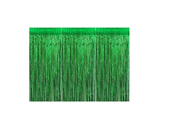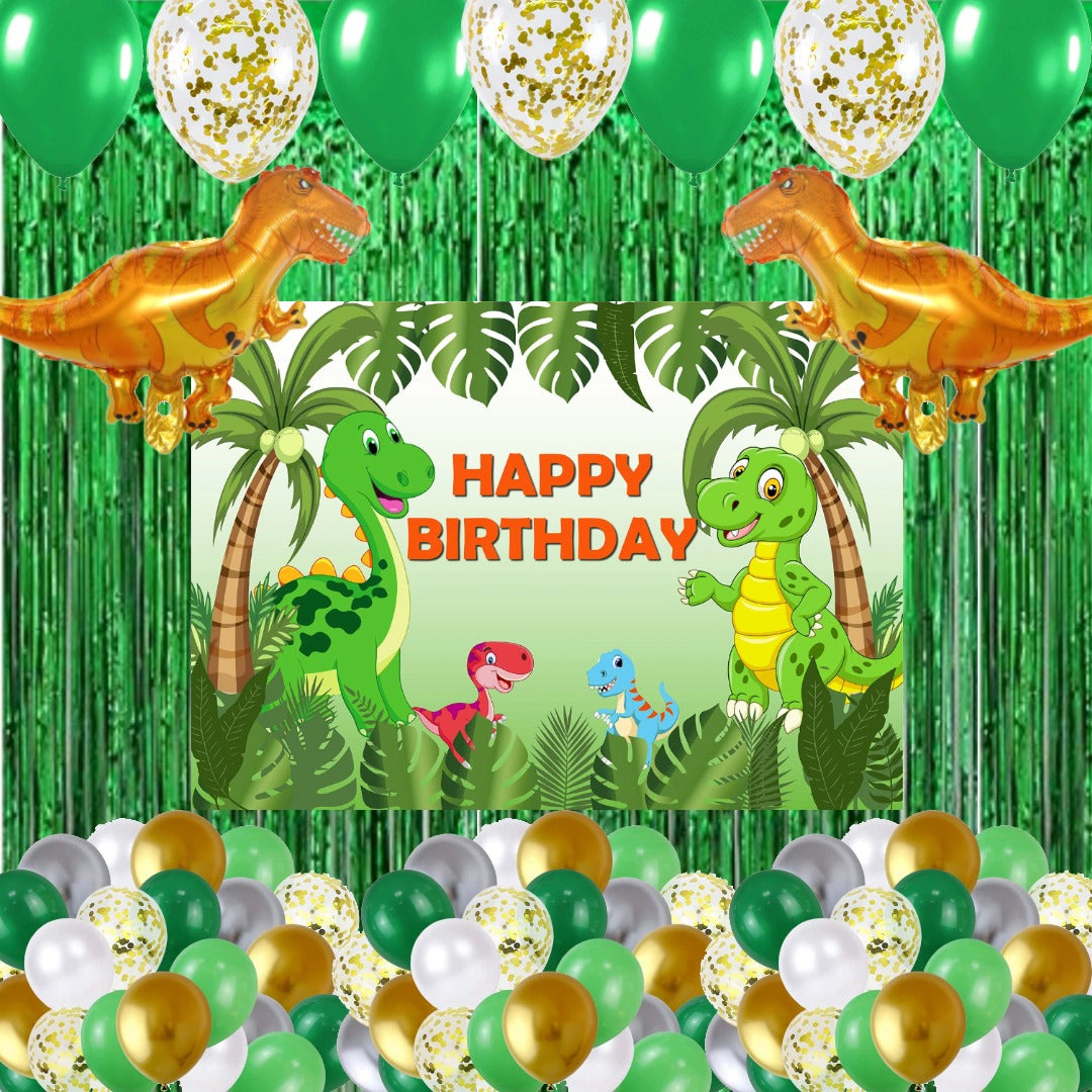- Package Includes: -2 Pcs Green Fringe Curtains, Backdrop - 4 by 4 ft, 60 pc Latex balloons (green, gold, silver and white -15 each),5 pc gold confetti 2 Pc Dinosaur Foil Balloons .