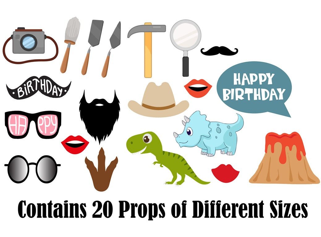 Dinosaur Theme photo prop pack accompanies 20 pieces and will add fun for kids and adults. Take entertaining party photos while making memories with these photo booth props. Everyone will adore the fun photographs they will make with these excellent props.