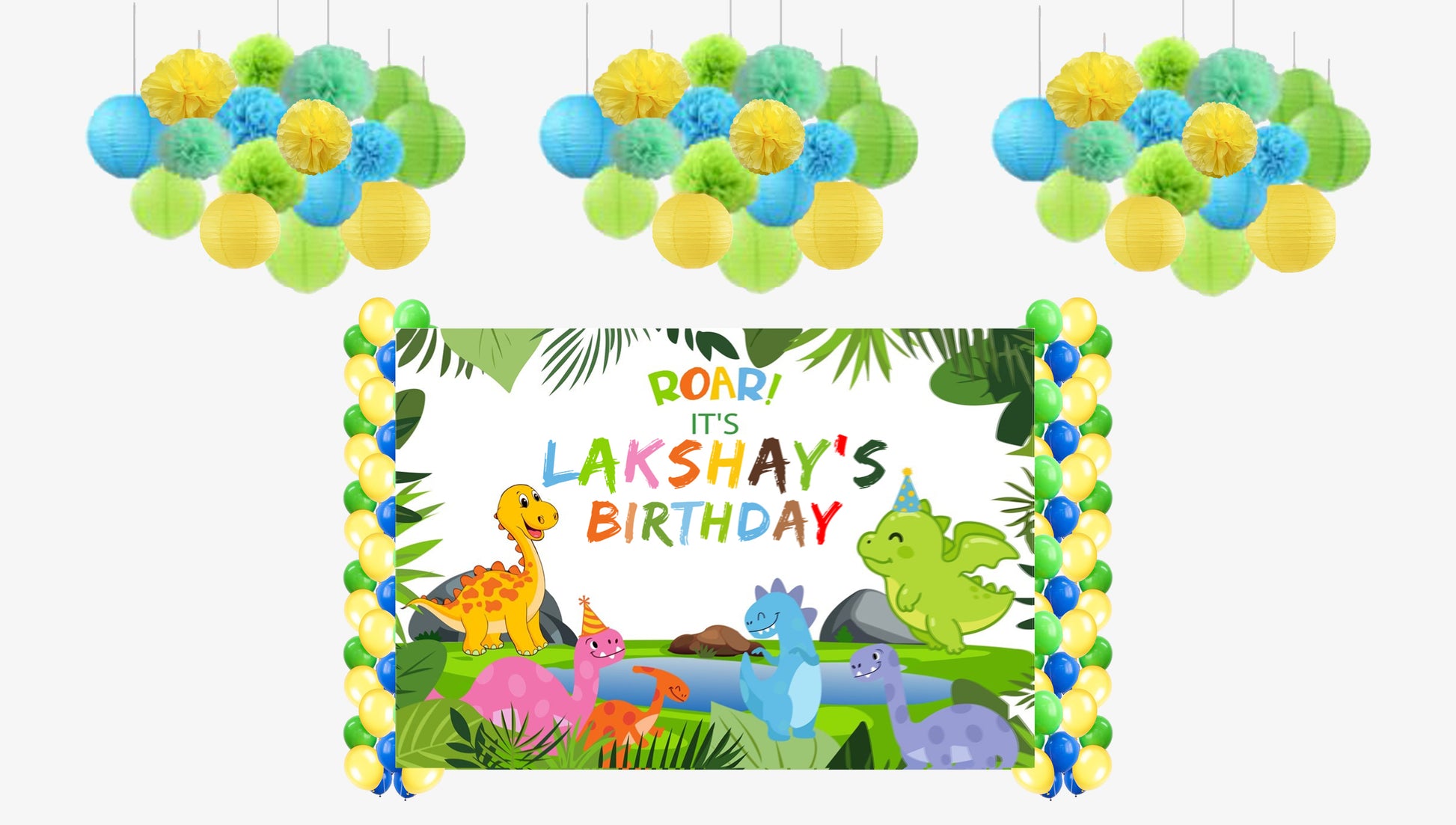 - Package includes - Backdrop-flex material light and thin, Balloons- 60 pcs Metallic 20 pc each green yellow and blue and 6 pc Pompom (3 pc each Yellow Blue and Green) and 6 pc paper Lantern (3 pc each Yellow, Blue and Green). All of the kit is useful for Dinosaur Theme Birthday party.