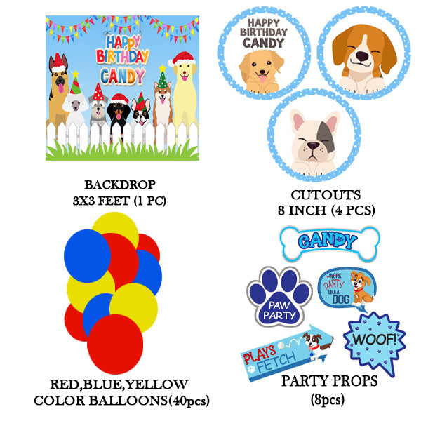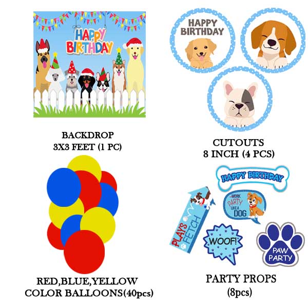 - Package Includes -, Backdrop - 3 by 3 ft, 40 pc Latex balloons (Red, Yellow, and Blue) and 4 paper Cutouts and 8 Paper Party Props.