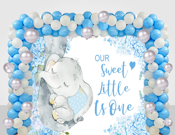 Package Includes - Elephant Birthday Theme Backdrop & Balloons. Total 50 balloons, 17 each -Silver, White and Sky Blue.