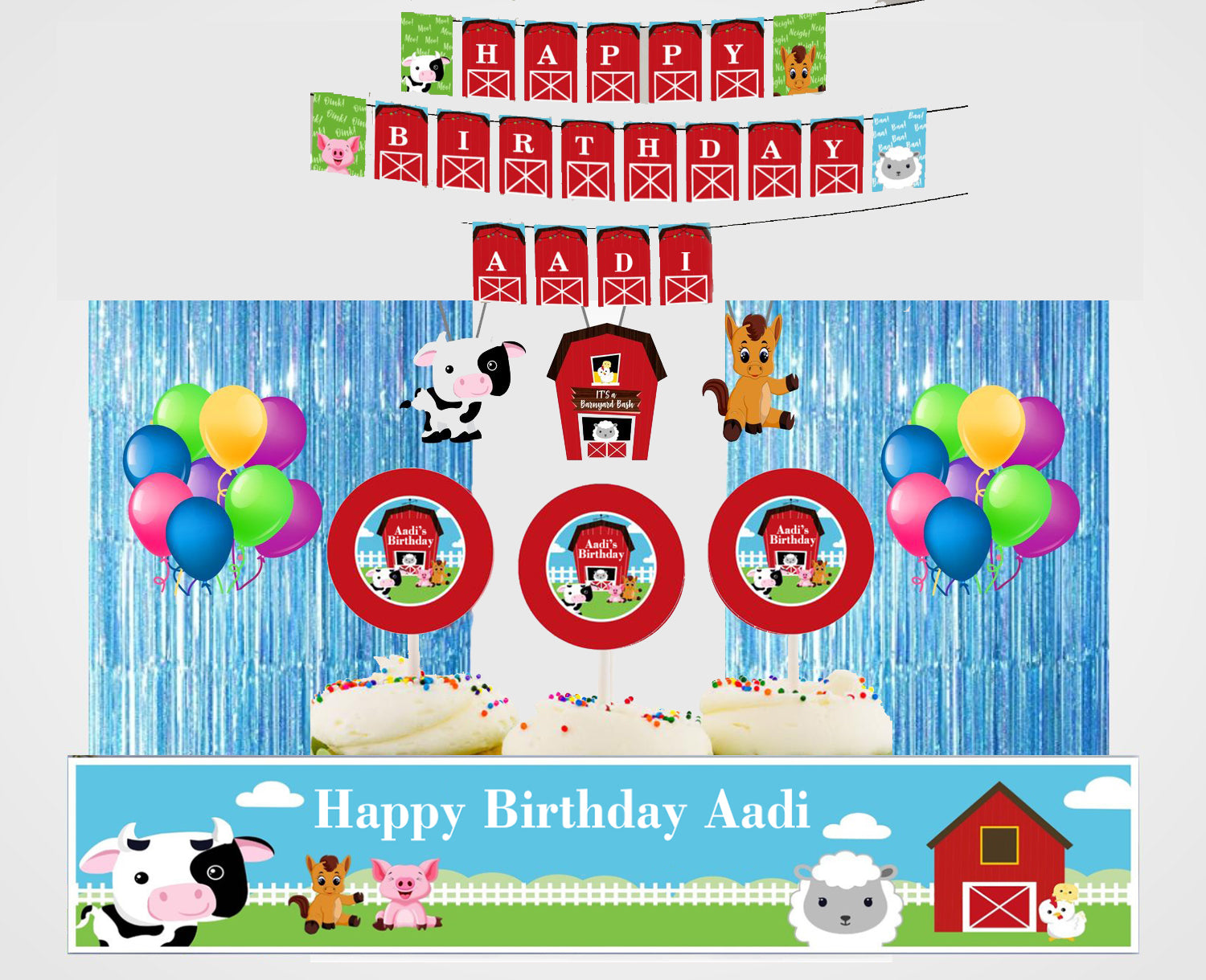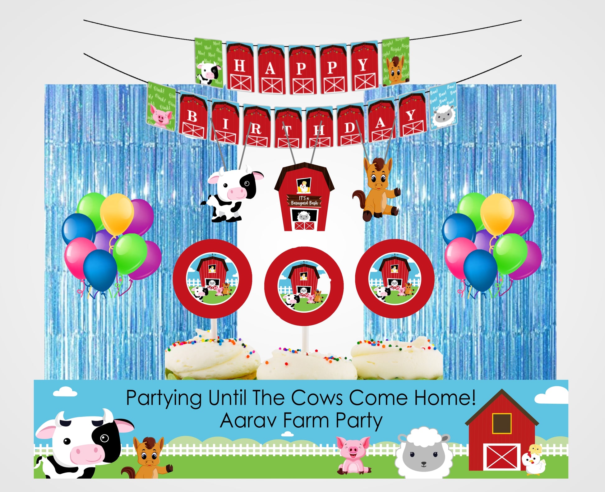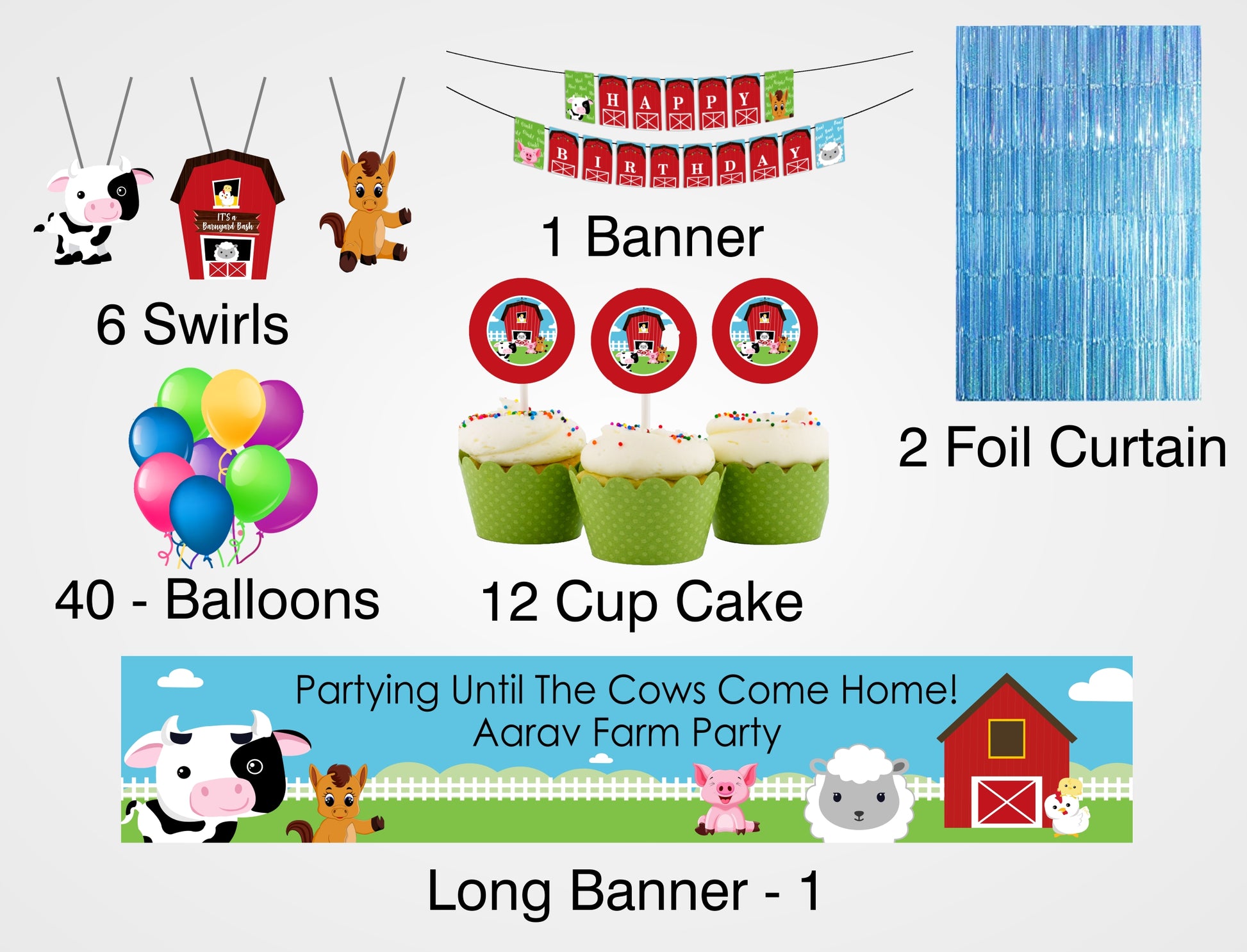 - Package Includes - 1 happy birthday letter banner, 6 pcs Swirls hangings,2 pcs blue Foil Fringe Shiny Curtain, 40 pcs Latex Balloons,12 cupcake topper and long banner. All of the kits are useful for Farm animal Birthday Party decorations.