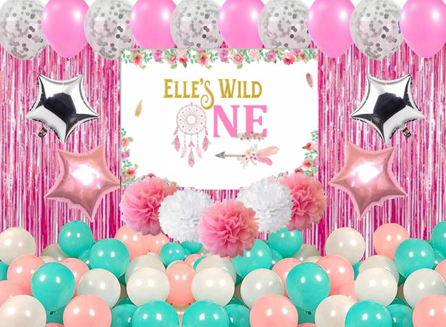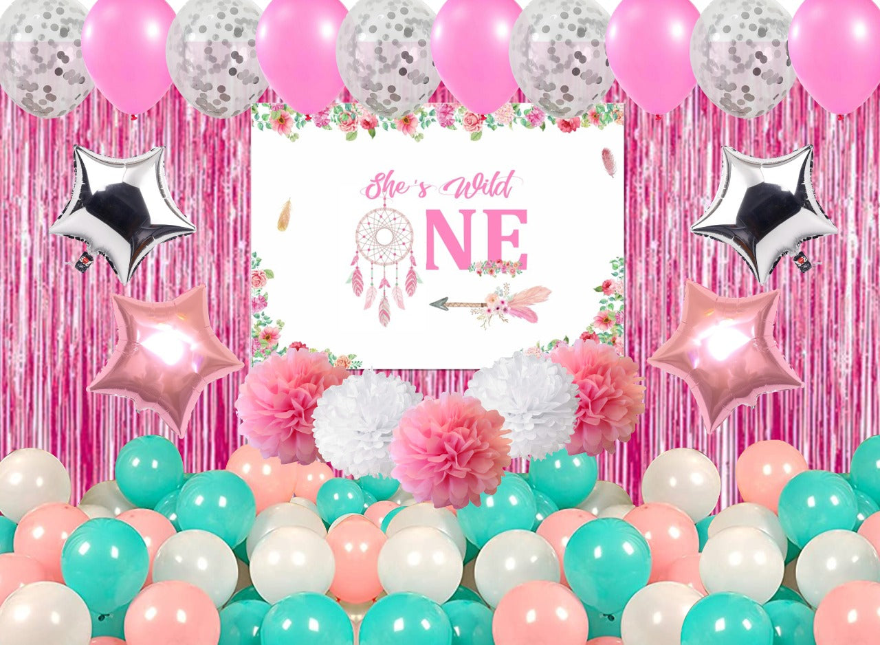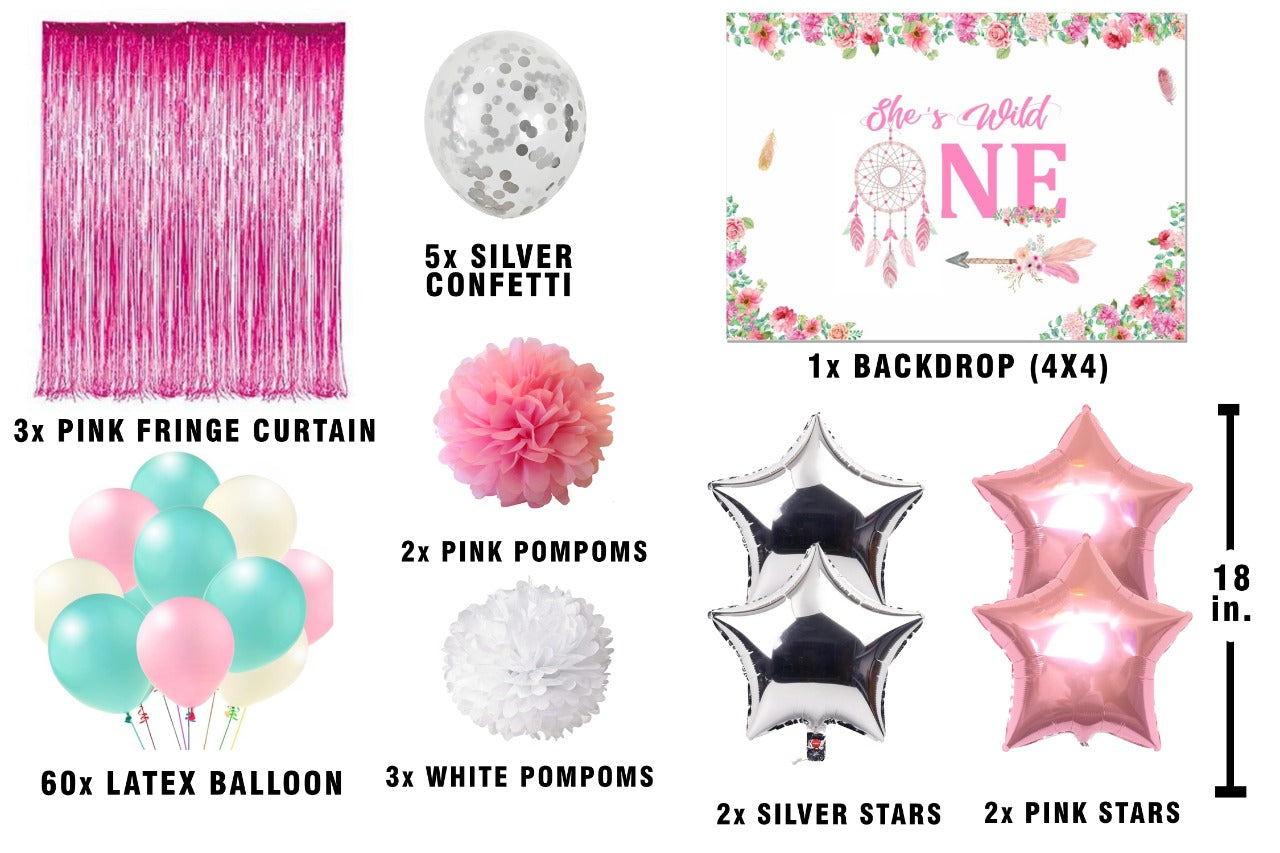 - Package Includes -3 Pcs Pink Fringe Curtains, Backdrop - 4 by 4 ft, 60 pc Latex balloons (pastel Pink, pastel green and white - 20 each), five pc Pink confetti, two pink star and two silver star 18" inch each and 5 Pompom-Pink and white.