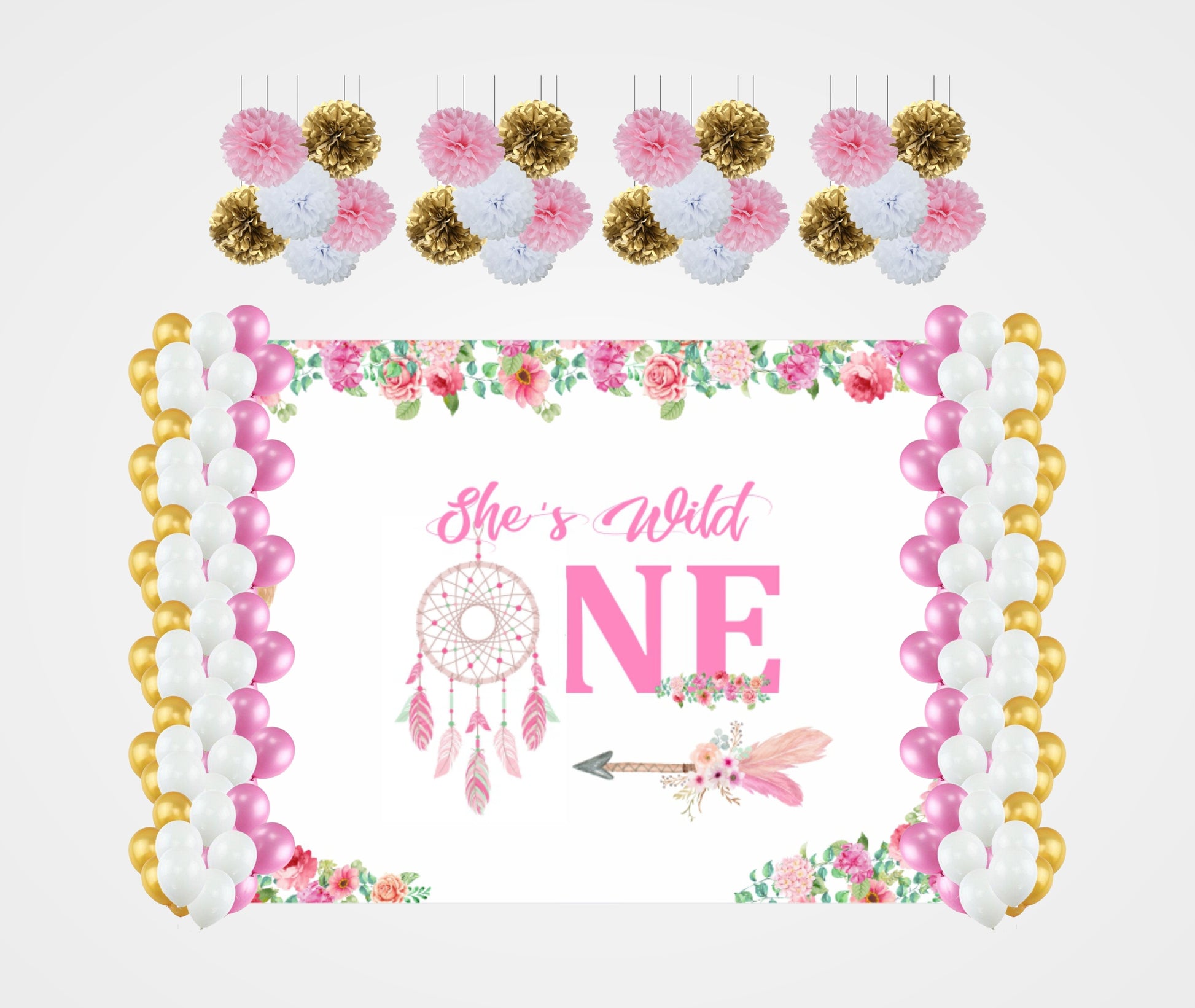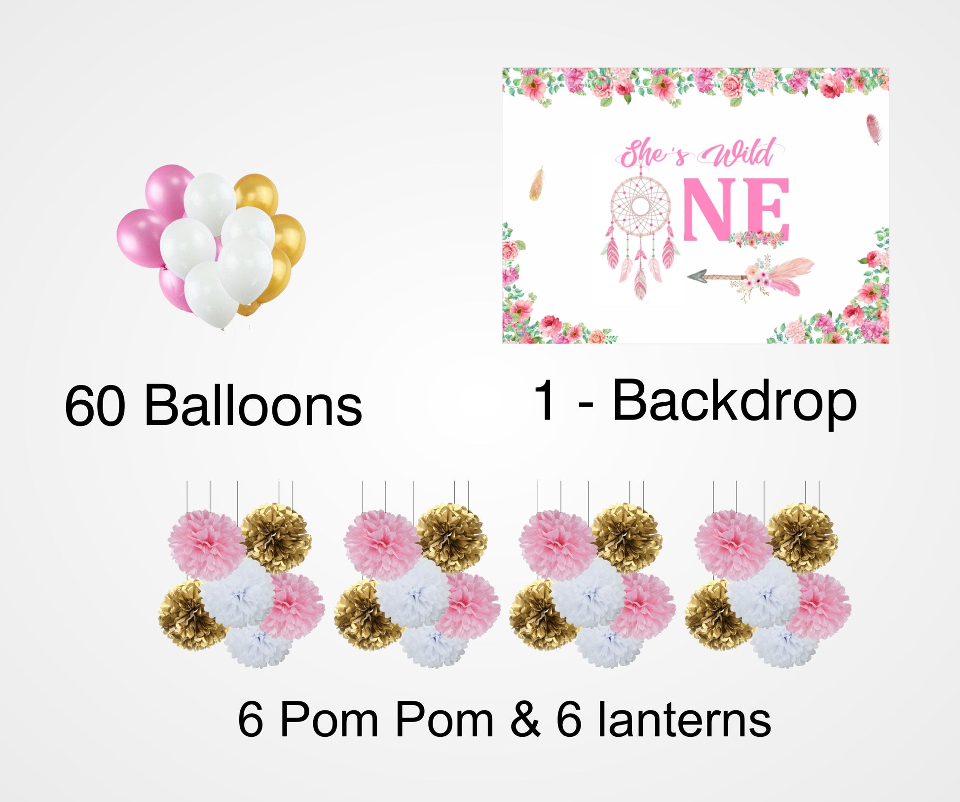 - Package includes - Backdrop-flex material light and thin, Balloons- 60 pcs Metallic 20 pc each Pink Gold and white and six pc Pompom (3 pc each pink white and Gold) and six pc paper Lantern (3 pc each Pink, white and Gold. All of the kits are useful for First Birthday Theme Birthday parties.