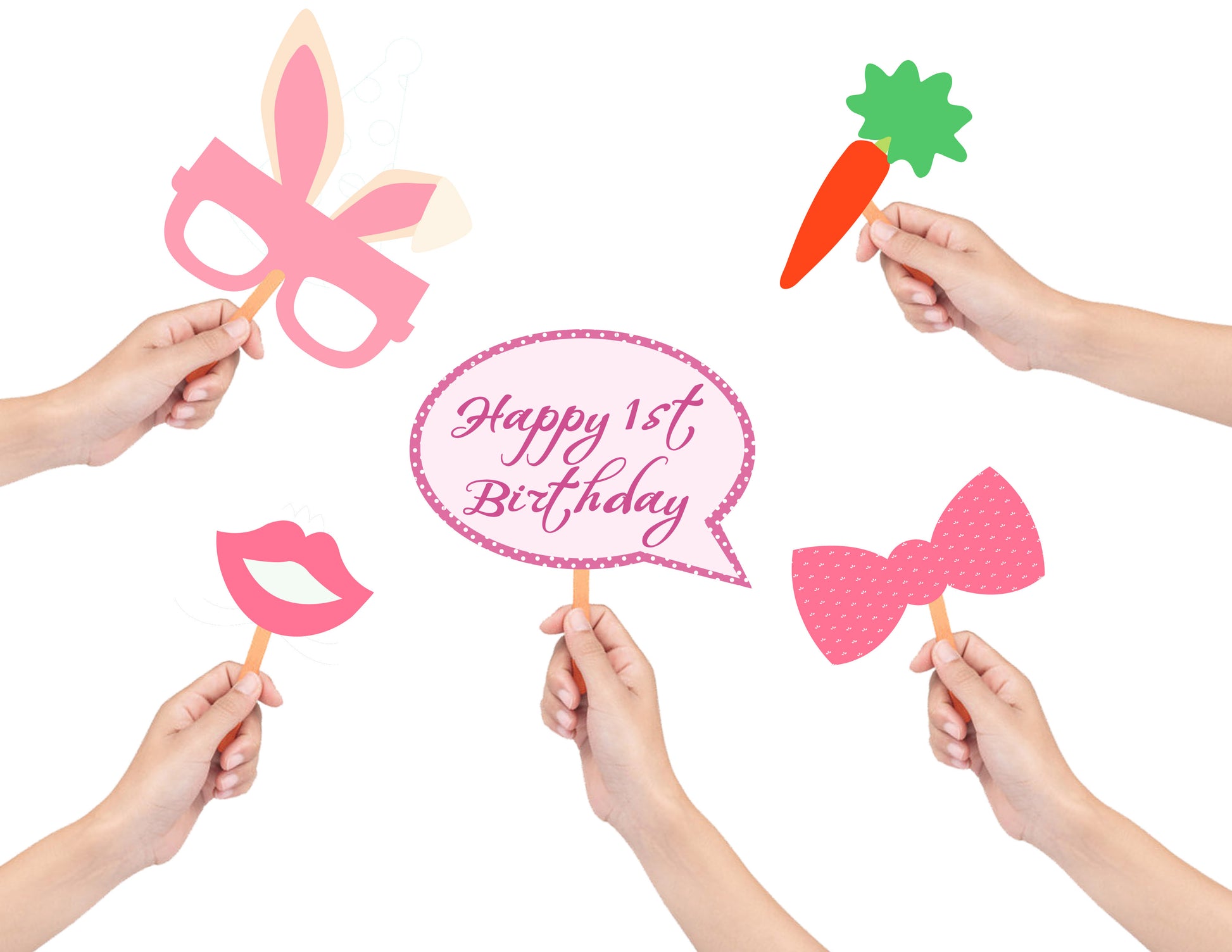- First Birthday Theme photo prop pack accompanies 20 pieces and will add fun for kids and adults. Take entertaining party photos while making memories with these photo booth props. Everyone will adore the fun photographs they will take with these excellent props.