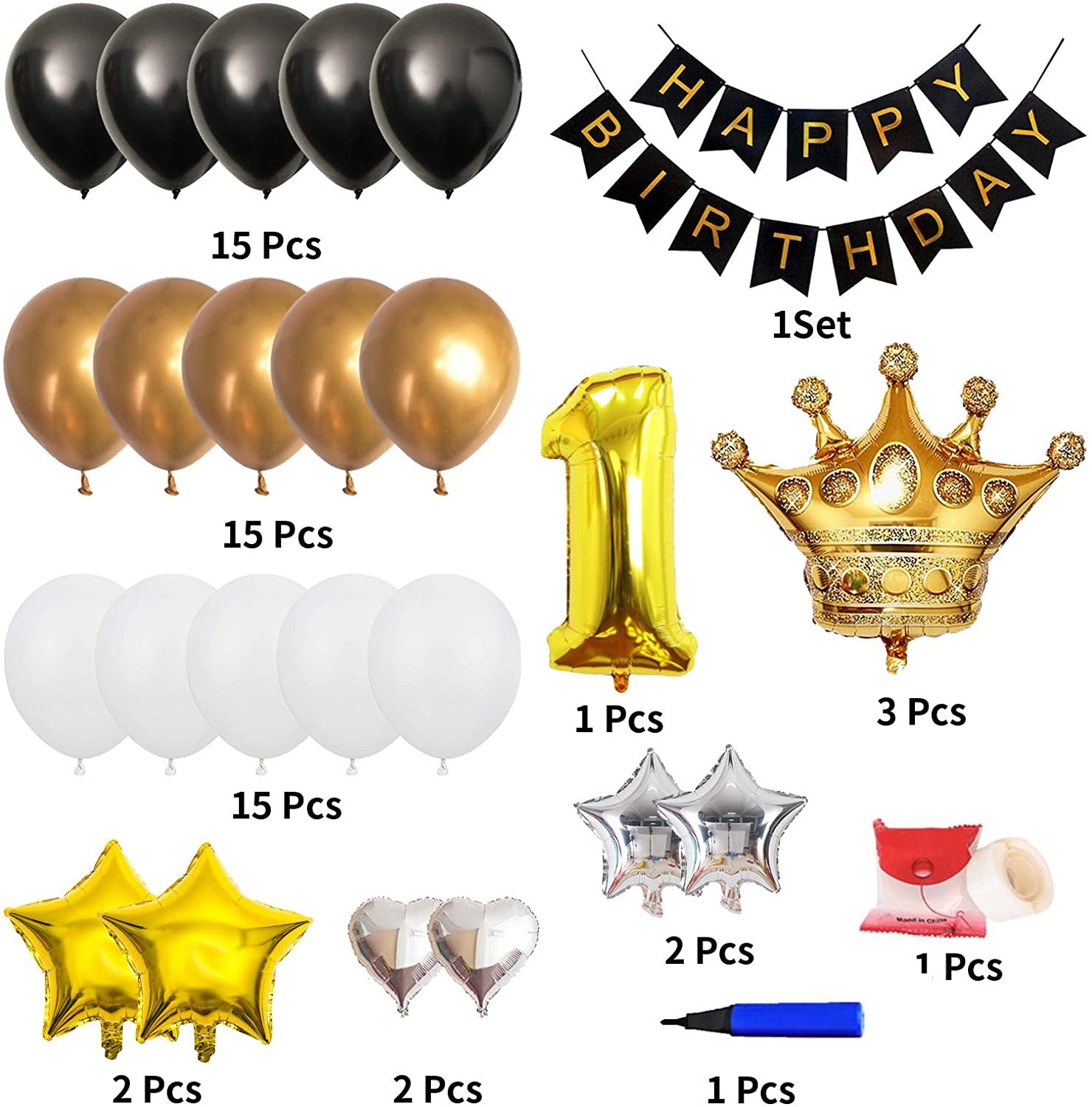 - Package Included 1 Letter Happy Birthday Banner Black Balloons, 18 inch Silver Star Balloons 2 pieces each, 18 inch Gold star 2 pieces each, 18 inch 2 silver star ,18 inch 3 Golden Crown , 9inch Latex Balloons 45 pieces -white 15 pieces white , 15 pieces gold and 15 pieces white , and one 100 pieces glue dot,1 Balloon Pump and 1 NO gold Digit -16" inch .