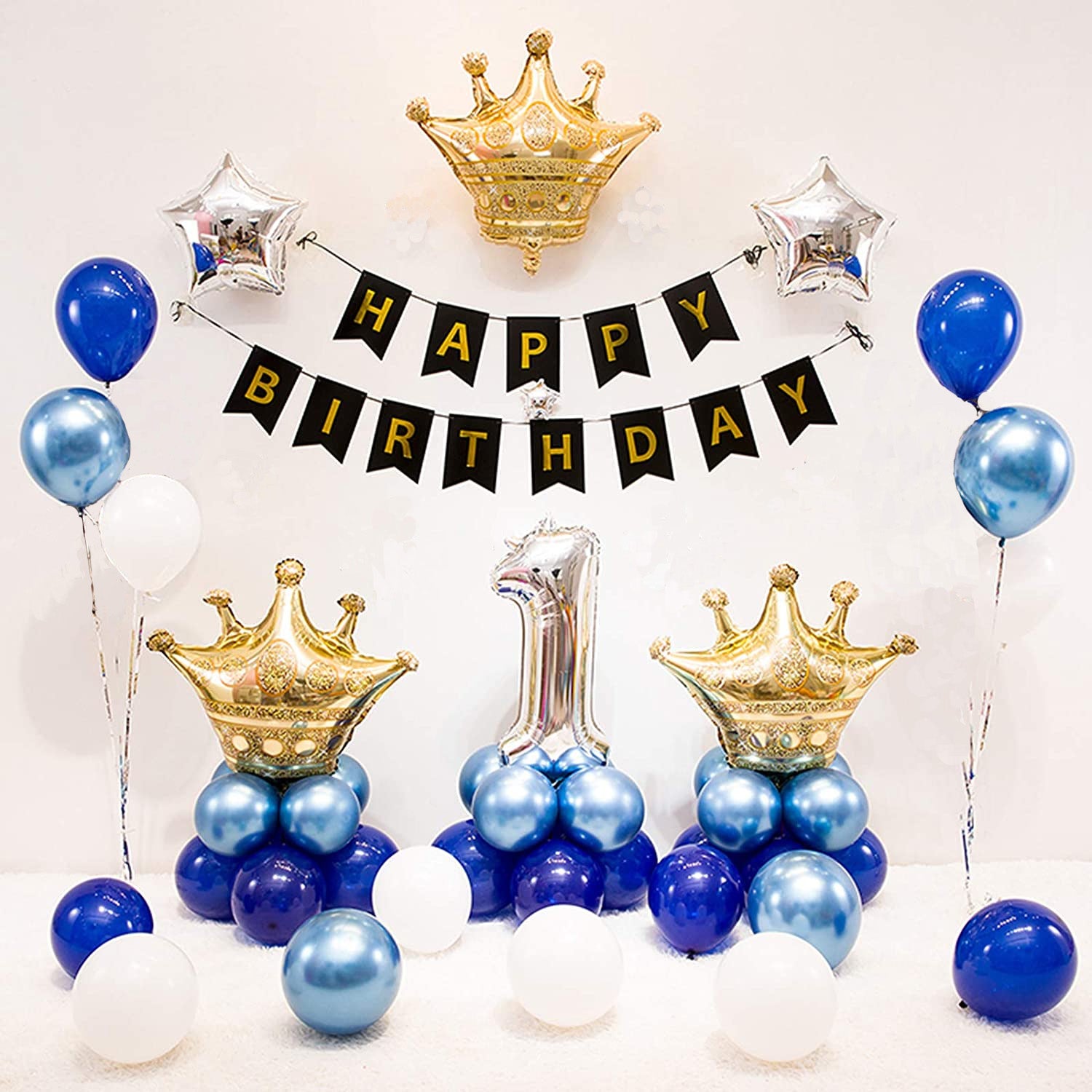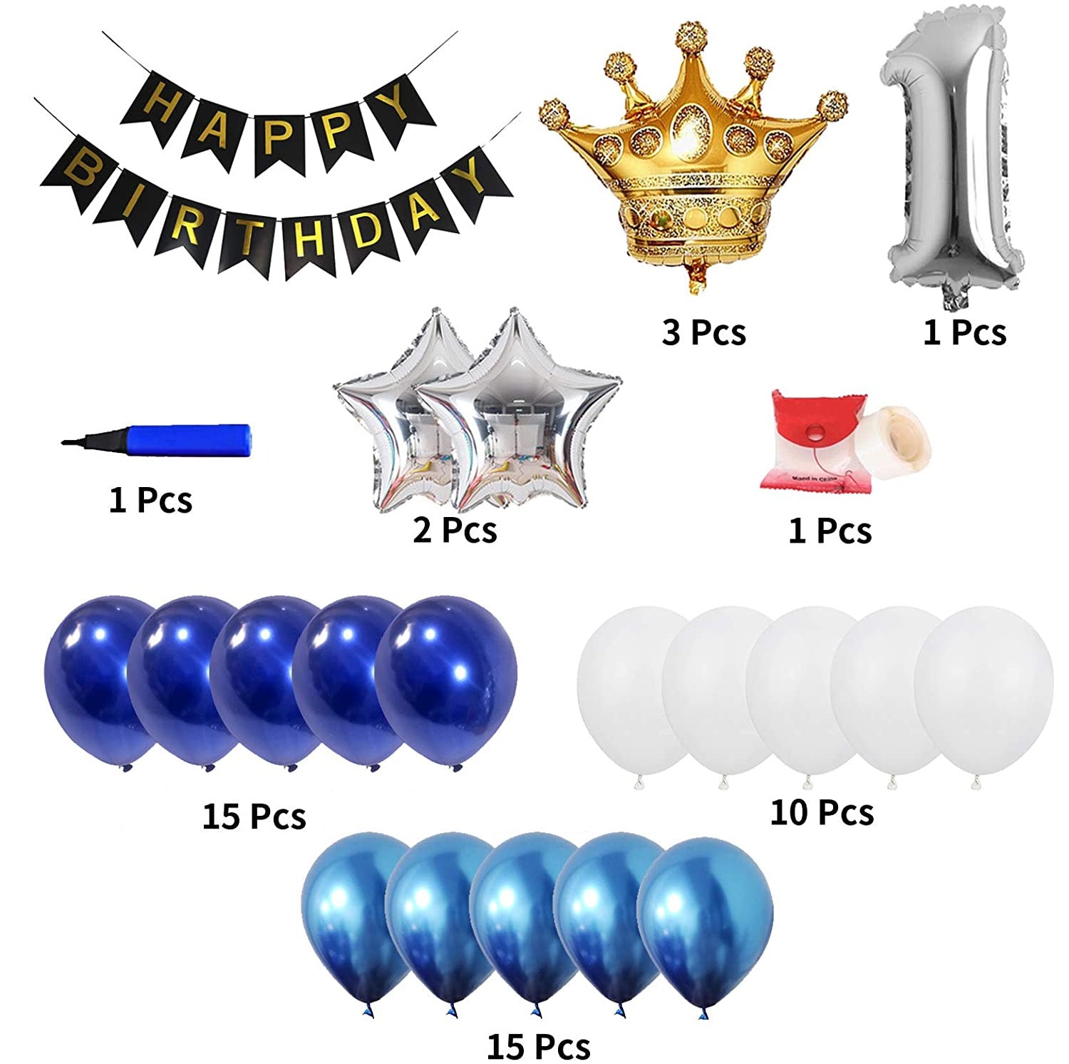 - Package Include-1 Letter Happy Birthday Banner Black Balloons, 18 inch Silver Balloons 2 pieces each, 3 Golden Crown , 9inch Latex Balloons 40 pieces -white 10 pieces white , 15 pieces dark blue and light blue , and one 100 pieces glue dot,1 Balloon Pump and 1 NO silver Digit -16" inch .