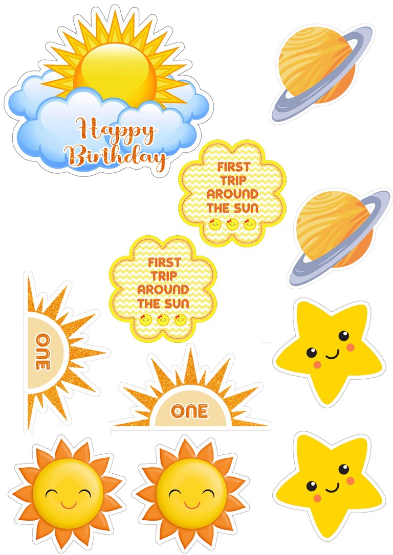 - How to use: - Include First Trip Around the Sun Theme Cake toppers to your treat table to make an extraordinary theme cake show. Style the big cake topper with the two huge picks and add one small selection to each of the ten cut-out shapes to finish the cake embellishment.