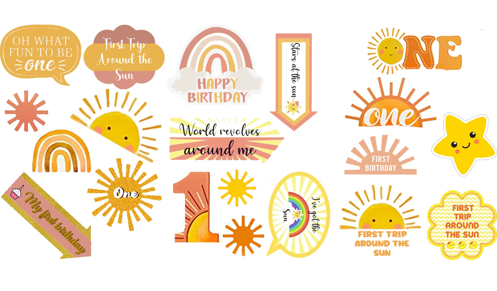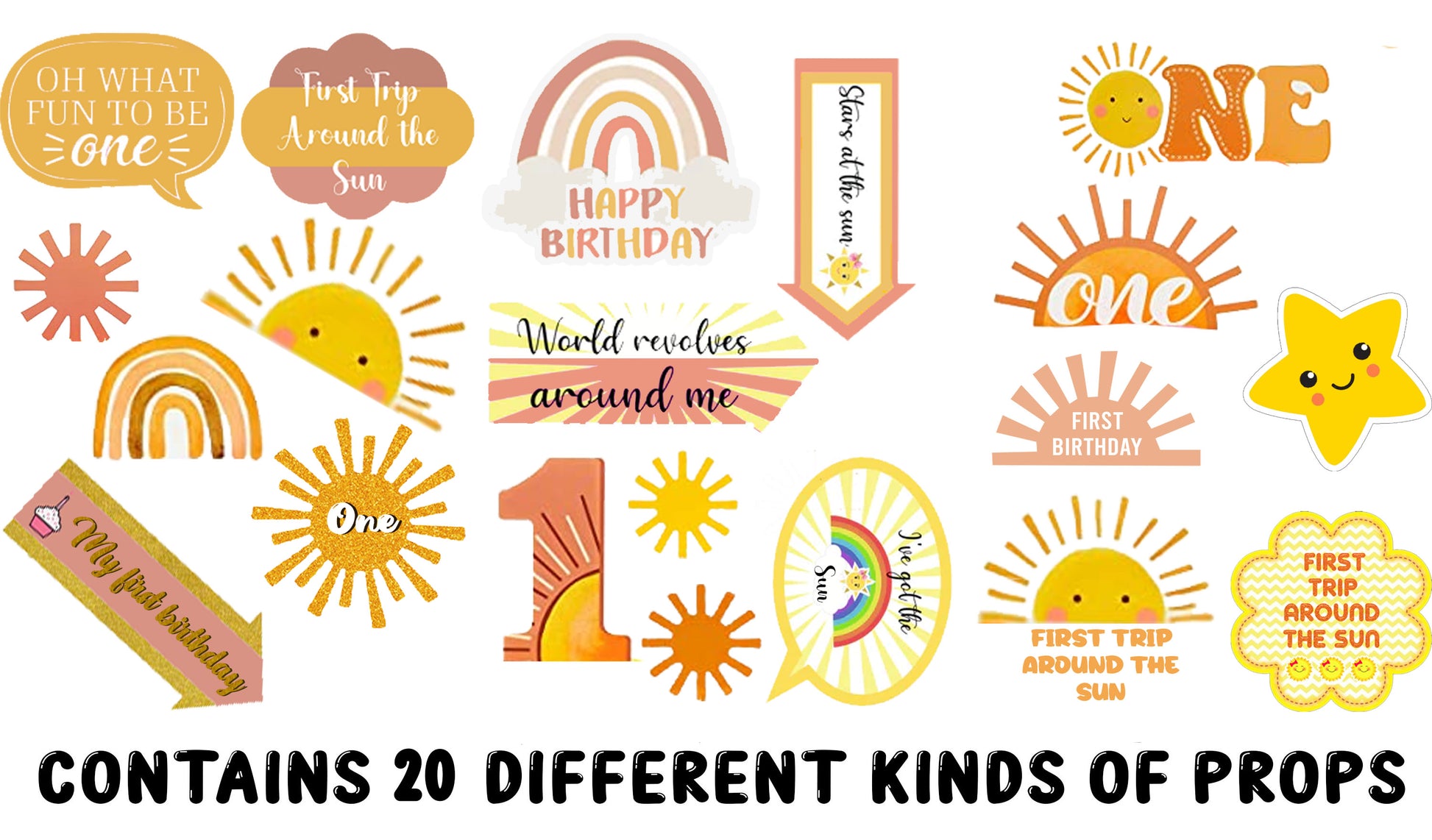 - First Trip Around the Sun Theme photo prop pack accompanies 20 pieces and will add fun for kids and adults. Take entertaining party photos while making memories with these photo booth props. Everyone will adore the fun photographs they will take with these excellent props.