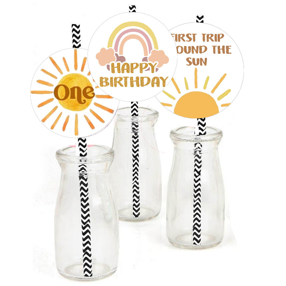 - The package includes - 24 First Trip Around the Sun theme paper cut-outs, 24 coordinating paper straws & a glue dot.