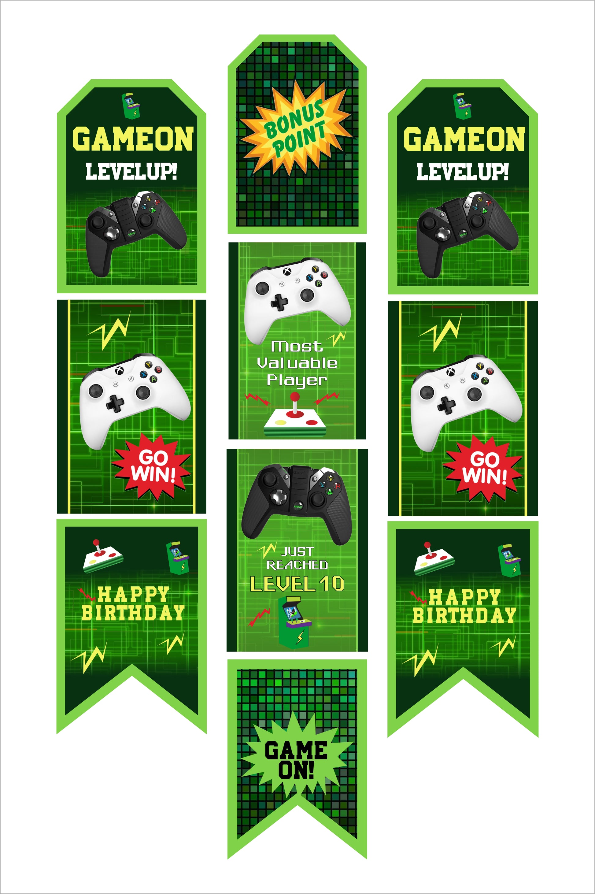 - Material: - Gaming Birthday Party Banner is expertly imprinted on solid card stock paper and incorporates ten classic pieces. The paper card and string come separately; simple DIY is needed.