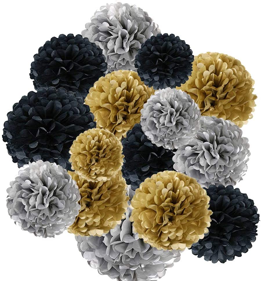 Golden ,Silver And Black Pom Pom Flower Decoration -Anniversary Parties & Milestone Birthday