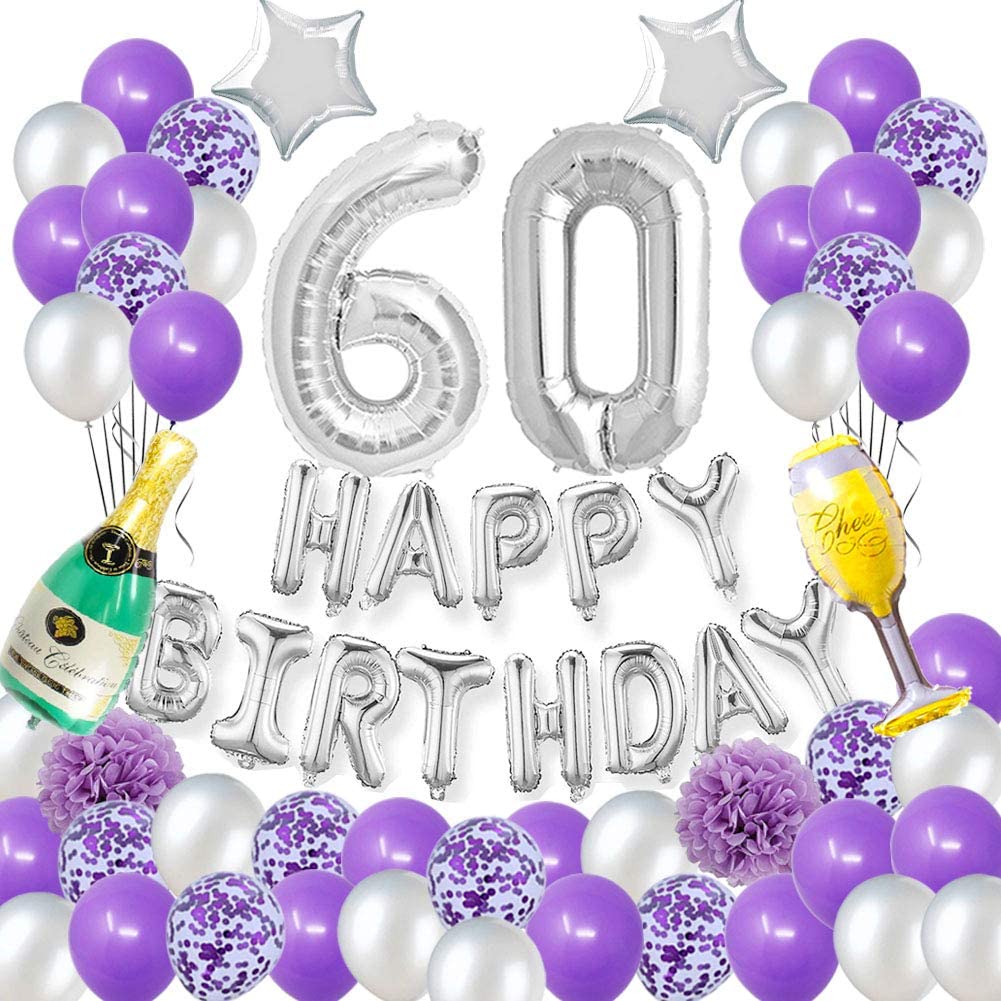 - PACK VALUE: Silver Banner “HAPPY BIRTHDAY”1 set, 16inch Foil number Balloons 60 , purple Latex Balloons silver Latex Balloons -10 each purple Confetti Ballons 5pcs, 36inch Foil balloons wine and bottle 2pcs, 18 inch silver Foil star Balloons 2 pcs,purple pom flowers