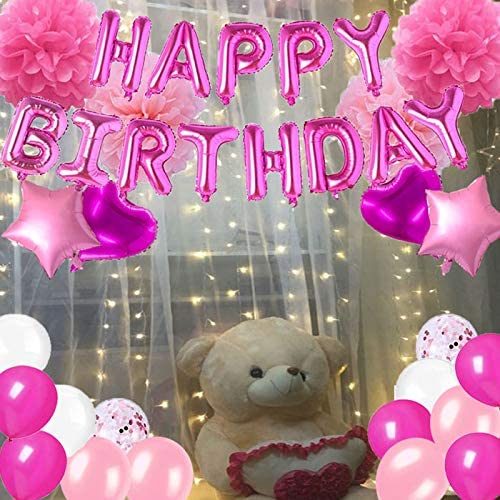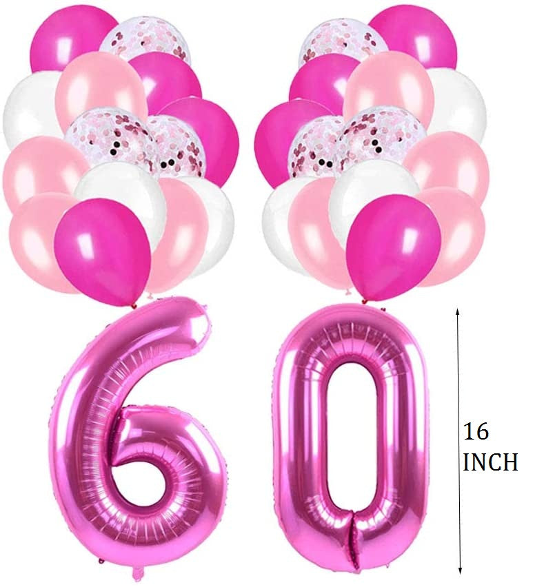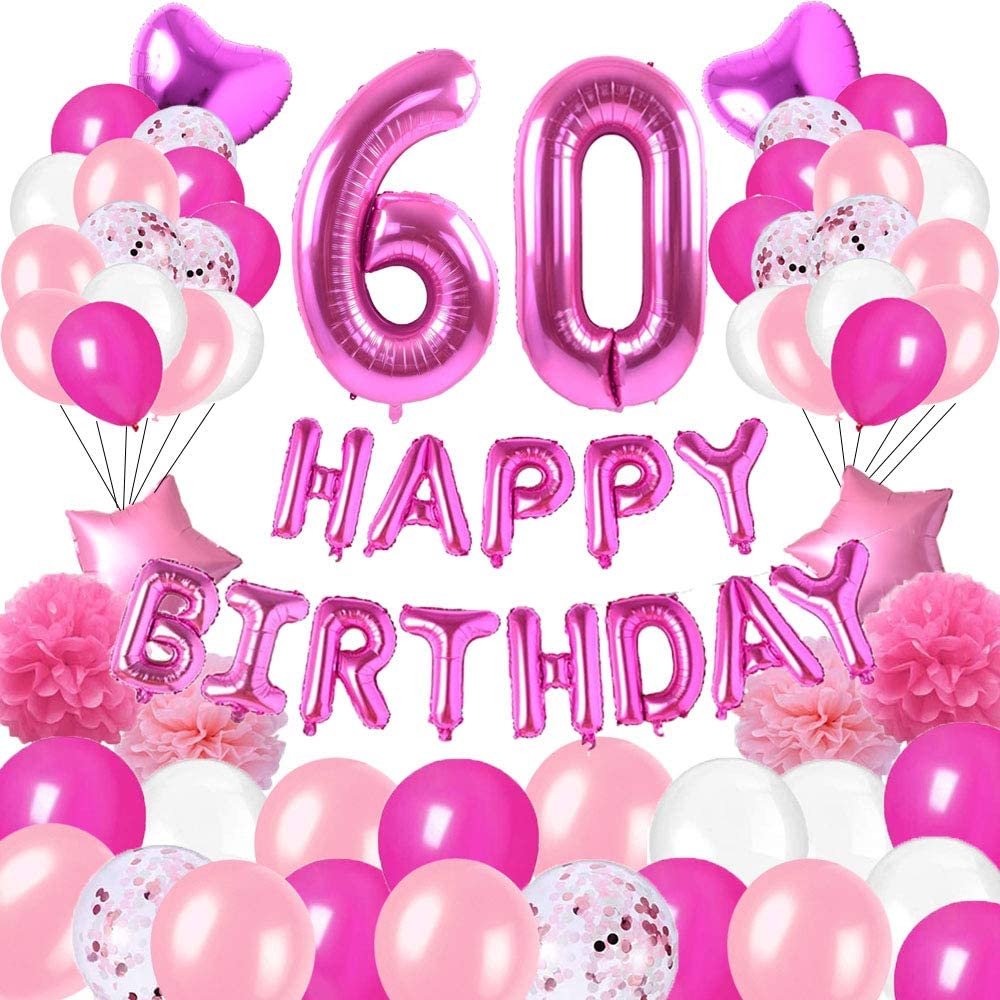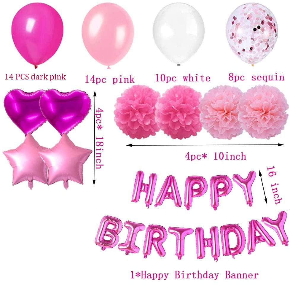 - VALUE PACKAGE:Package includes:14 pcs Pink latex balloons,14 pcs Rose Red latex balloons,10 pcs white latex balloons and 8 pcs Rose Red sequin balloons-12inch,2 pcs foil star shape balloons and 2 pcs foil heart shapes balloons-(18inch),4 pcs Pom Pom Flower Balls (Dark Pink and light pink,each 2 ) -10 inch,2 set foil number balloons"60"-16inch, 1 set Rose Red HAPPY BIRTHDAY banner,
