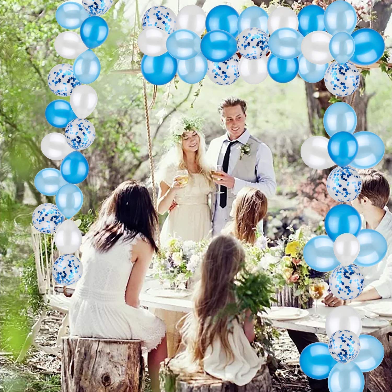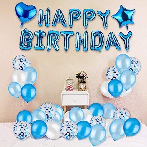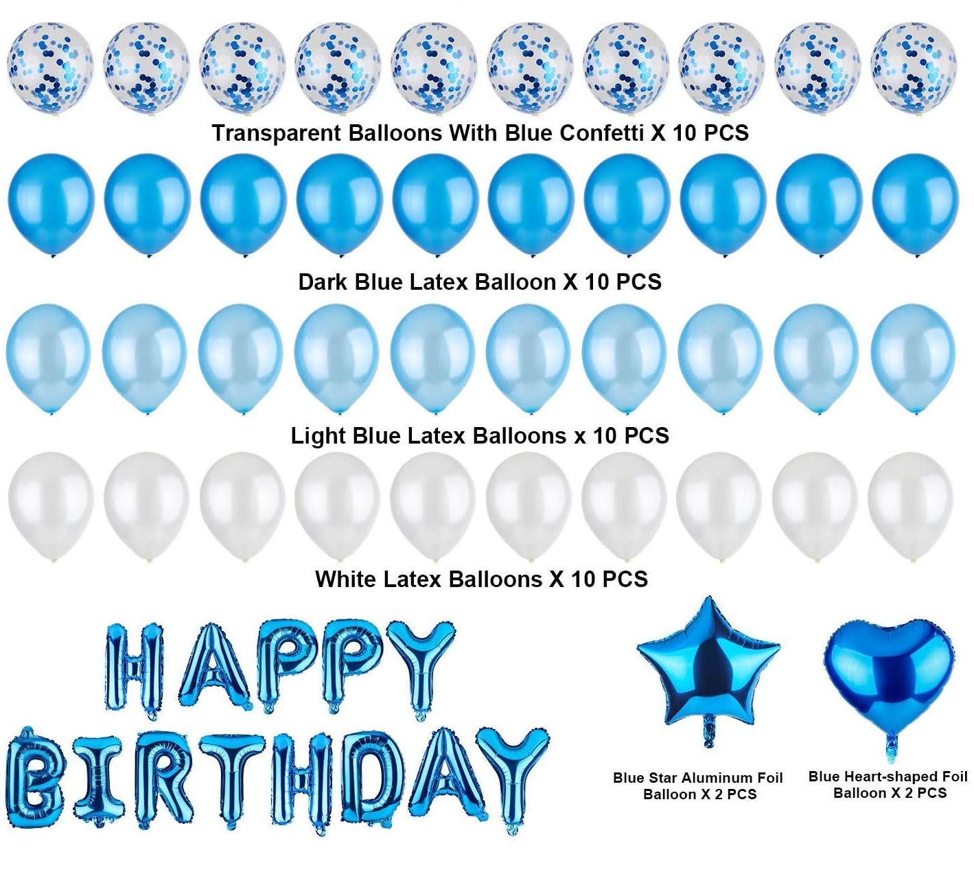You will get 13 Happy Birthday Mylar foil balloons, 10 blue latex balloons, 10 light blue latex balloons, 10 white latex balloons, 10 birthday balloons with pre-filled blue metal aluminium foil confetti and 4 18-inch heart-shaped star-shaped aluminium foil balloon birthday set