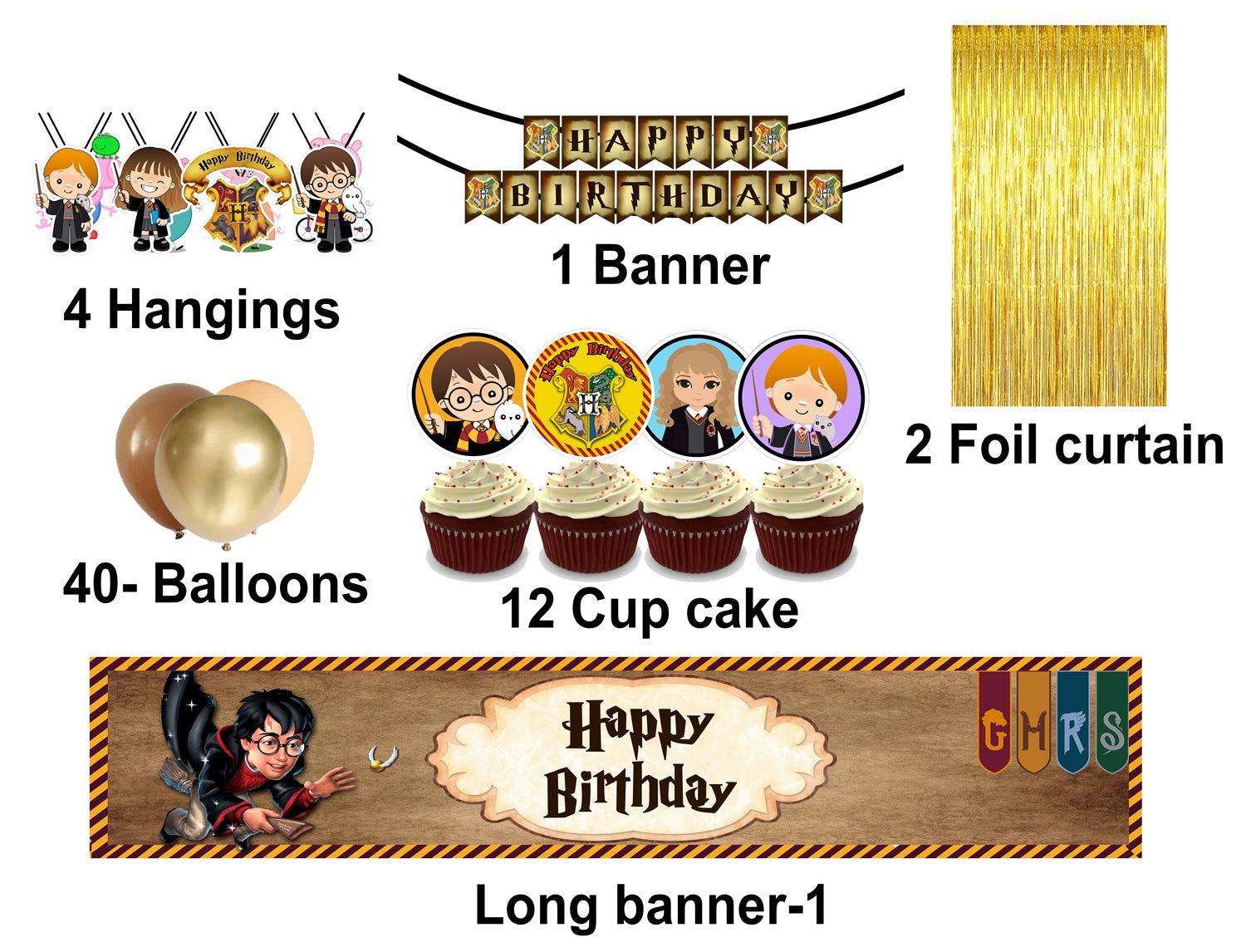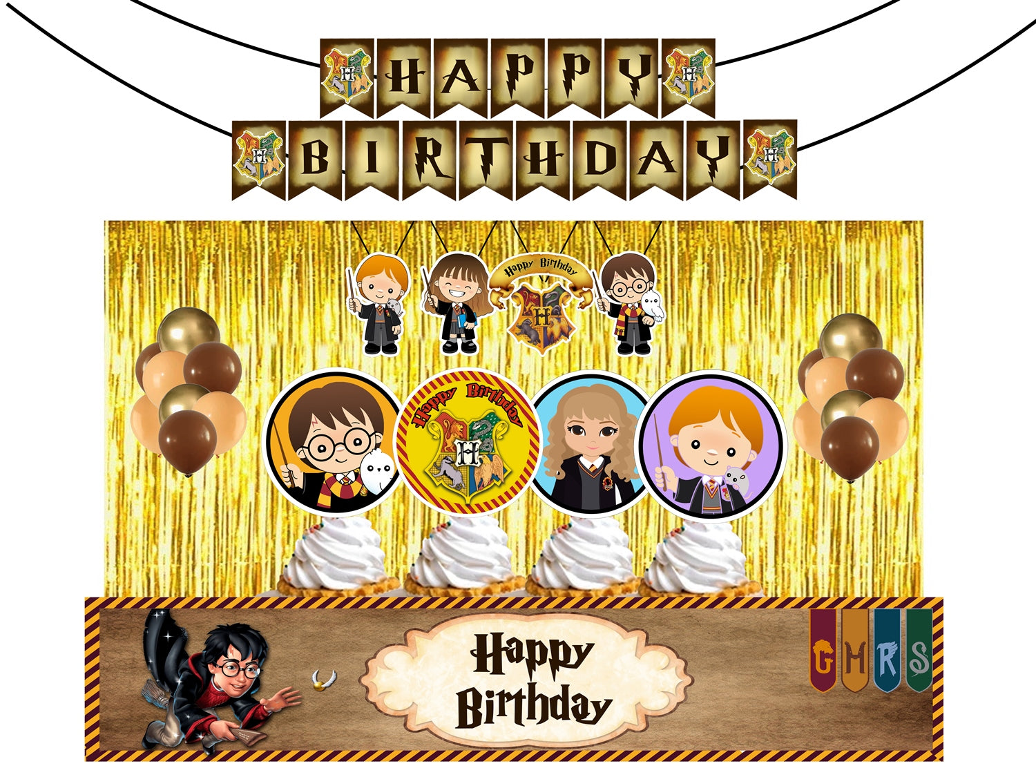 - Package Includes - 1 happy birthday letter banner, 6 pcs Swirls hangings,2 pcs Gold Foil Fringe Shiny Curtain, 40 pcs Latex Balloons-Gold rose gold and brown ,12 cupcake topper and long banner. All of the kits are useful for Harry potter Party decorations.