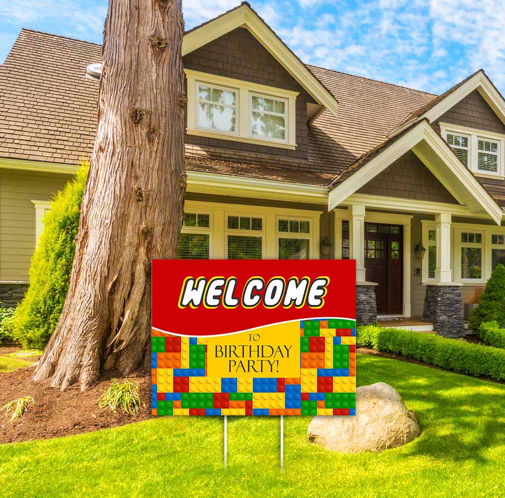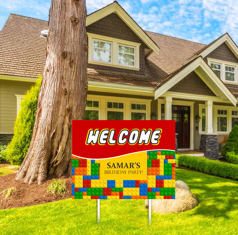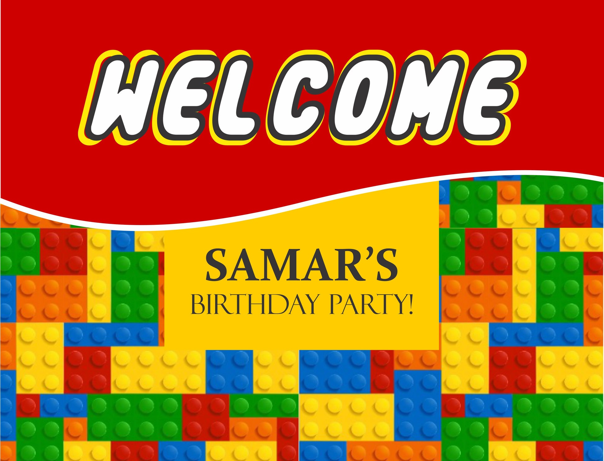 The Lego theme Welcome board sign is ideal for any home location or outside space. Welcome your friends and family members with a stunning welcome birthday party board.