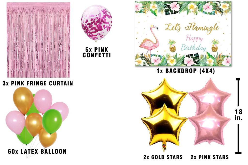 - Package Includes : 3 Pcs pink Fringe curtains; 1 First birthday backdrop- Size 4ft by 4ft, 60 pc latex balloons (pink, green and gold - 20 each); 5 pc pink confetti , 2 gold star and 2 pink star 18"inch