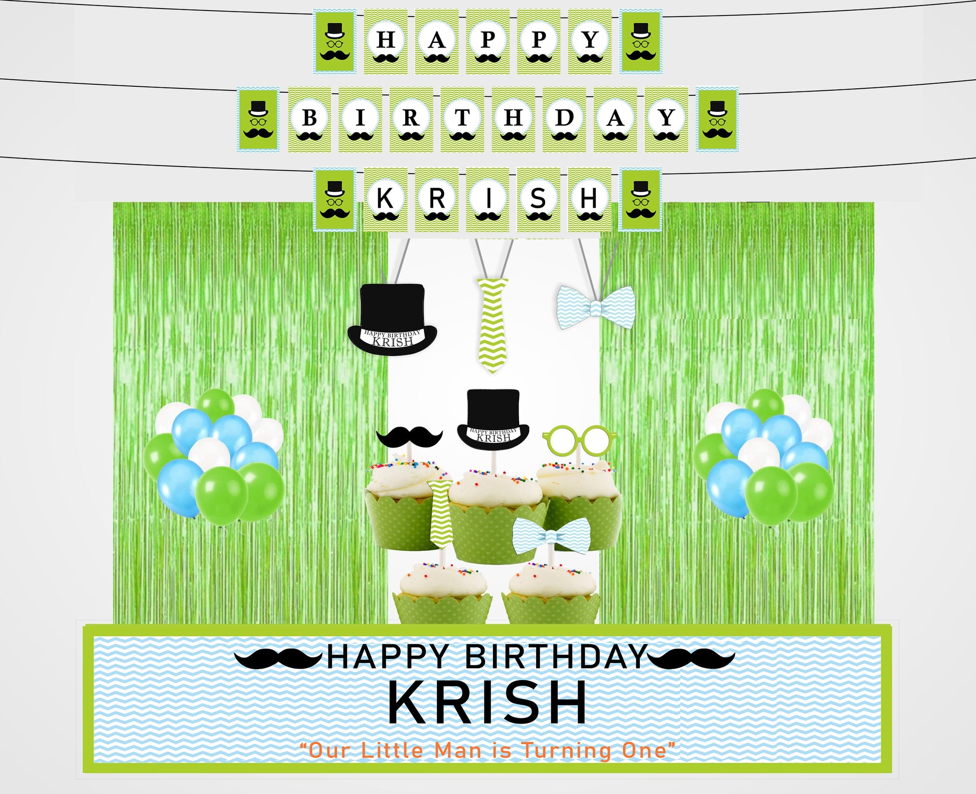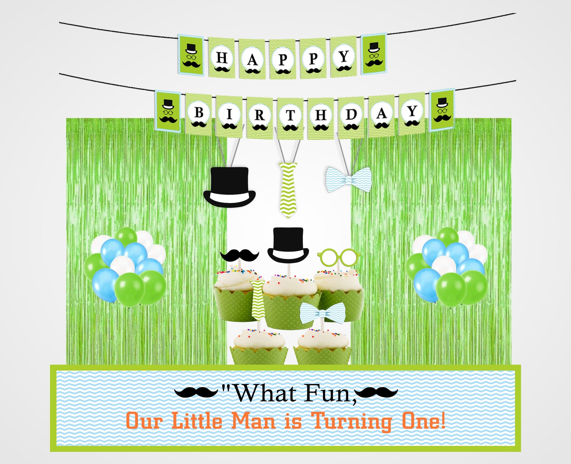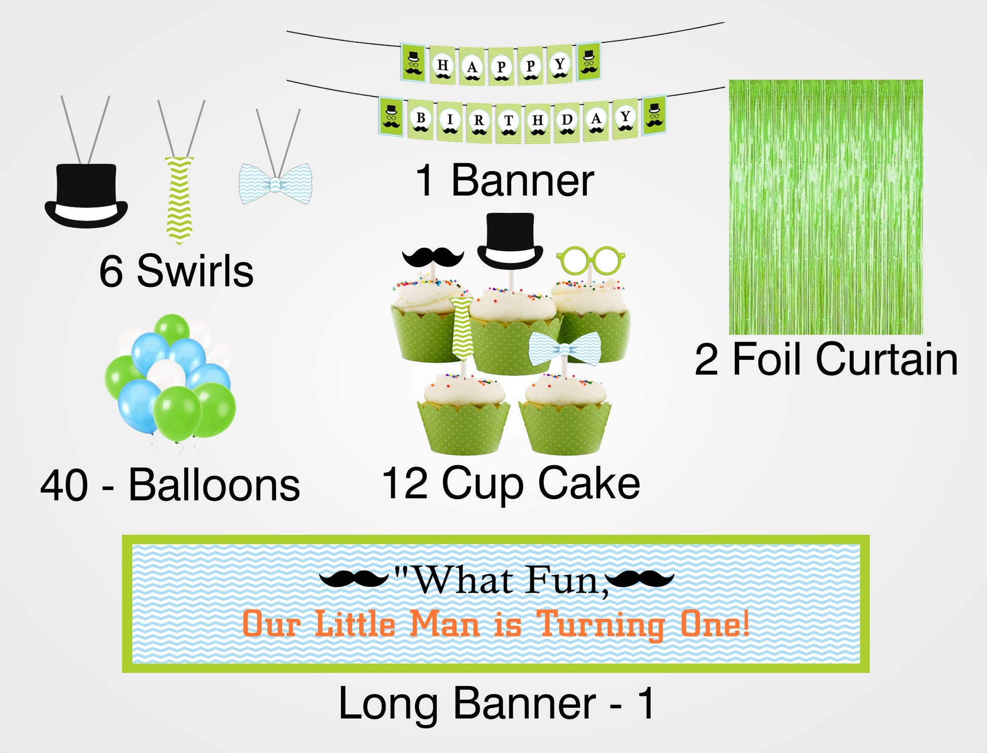 - Package Includes - 1 happy birthday letter banner, 6 pcs Swirls hangings,2 pcs Green Foil Fringe Shiny Curtain, 40 pcs Latex Balloons-Green Blue and White 12 cupcake topper and long banner. All of the kits are useful for Little Man Party decorations.